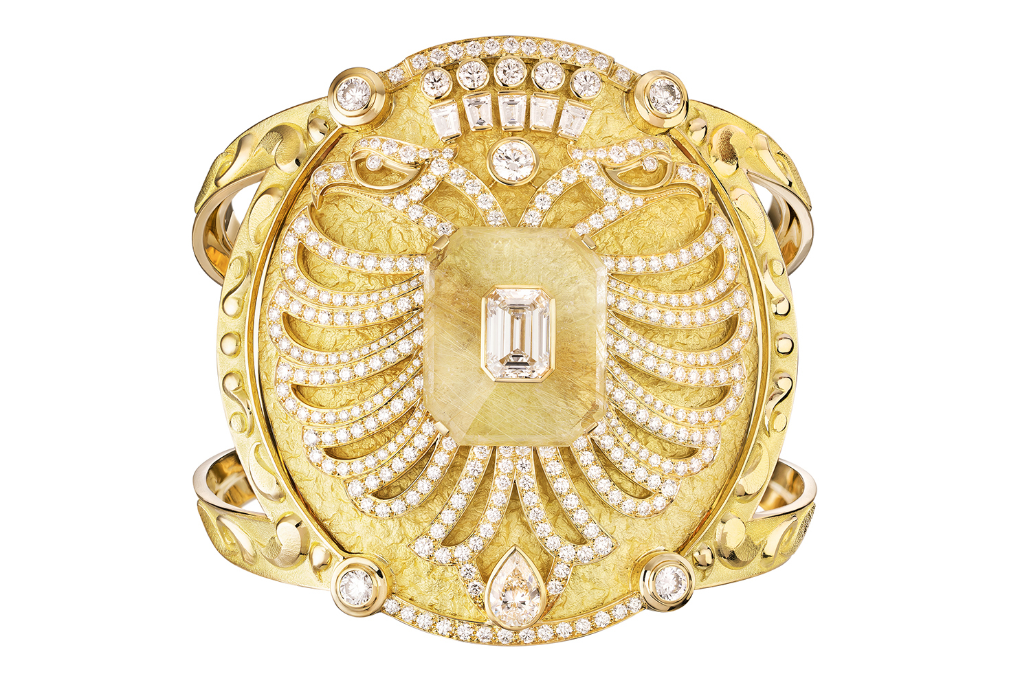 Эта геральдическая фигура стала отправной точкой дизайна одной из линий украшений La Paris Russe de Chanel. Шестьдесят три предмета драгоценного собрания образуют десять тем, или линий, каждую из которых вдохновил тот или иной русский мотив. Так, объемный силуэт двуглавого орла, символ российского самодержавия, появляется в золоте и бриллиантах сразу в двух линиях украшений, Aigle и Aigle Protecteur, – как буквальная цитата и как завуалированный в драгоценном сиянии фантом. Другой отличительный имперский знак принадлежности к кругу военных героев (каковым был и князь Дмитрий) – орден в виде лучистой звезды – стал главным мотивом в линии Medaille Solaire.