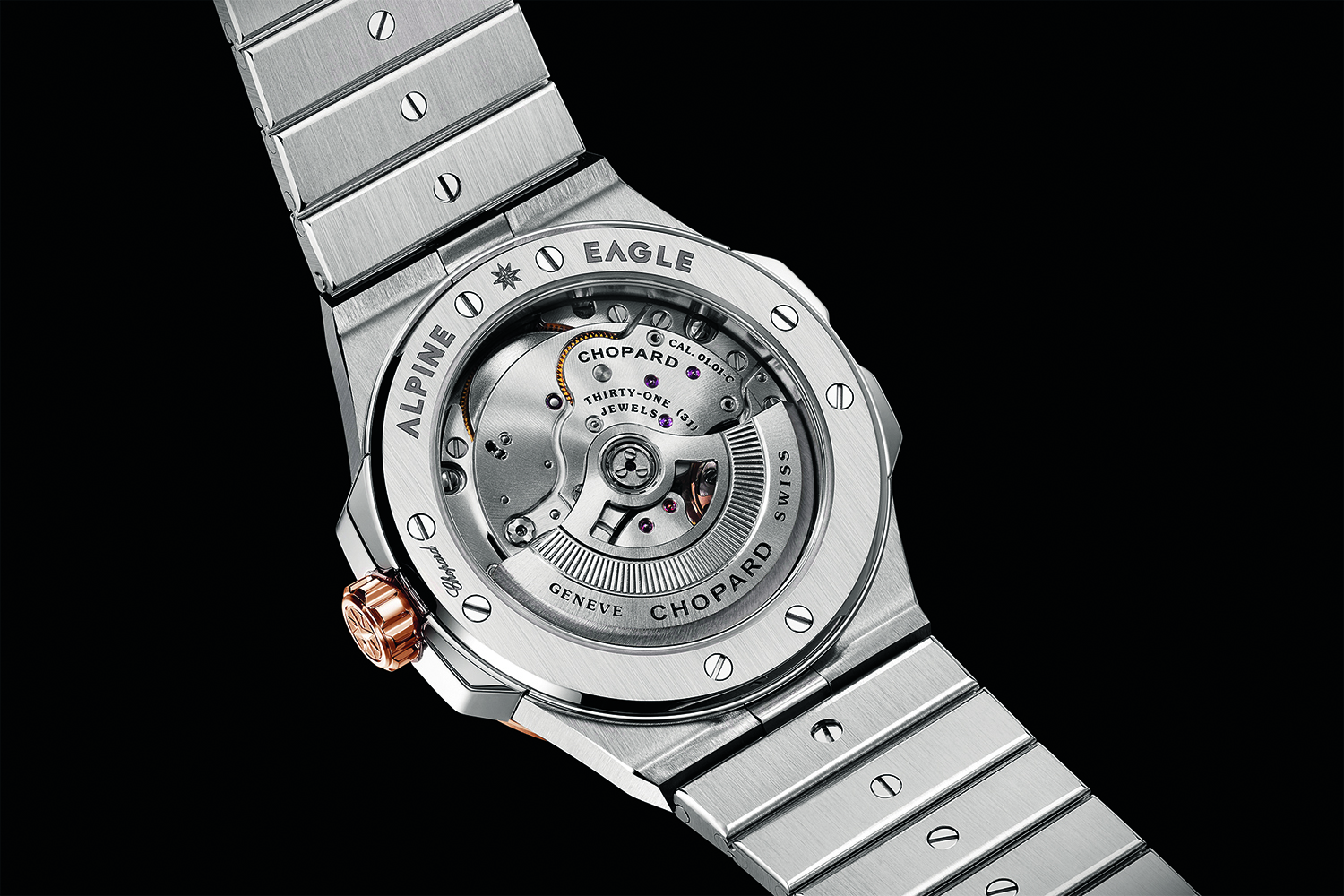 Имея такого туза на руках, было бы глупо рано или поздно им не воспользоваться. И вот наконец осенью нынешнего года компания Chopard решилась на перевыпуск исторических спортивно-элегантных часов с изобретенным в 1980 году широким плоским ободком на восьми винтах и с браслетом интегральной конструкции. Название «Санкт-Мориц», очевидно, было признано неподходящим и слишком узкогеографическим, и выбор был сделан в пользу птицы более высокого полета: встречайте Alpine Eagle, «альпийского орла».