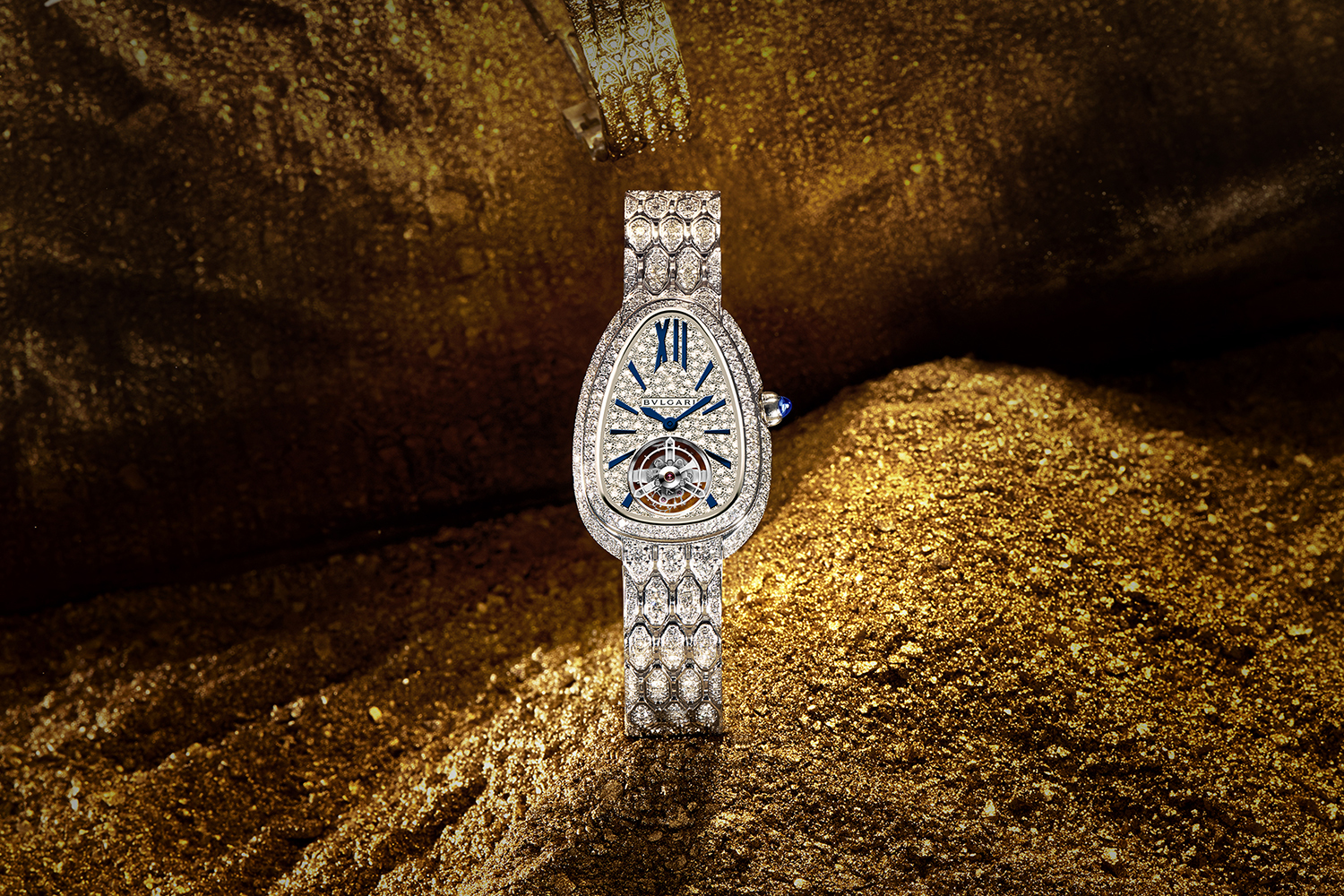 Самой впечатляющей новинкой Bvlgari стала модель Serpenti Seduttori Tourbillon – теперь это самые маленькие в мире женские часы с турбийоном, новый рекорд римского Дома. Их мануфактурный механизм BVL150 несколько лет специально разрабатывали для миниатюрного корпуса в форме змеиной головы. Другими словами, калибр имеет беспрецедентную форму смягченного треугольника и помещен в часы в корпуса из всех оттенков золота, с бриллиантами и без оных.