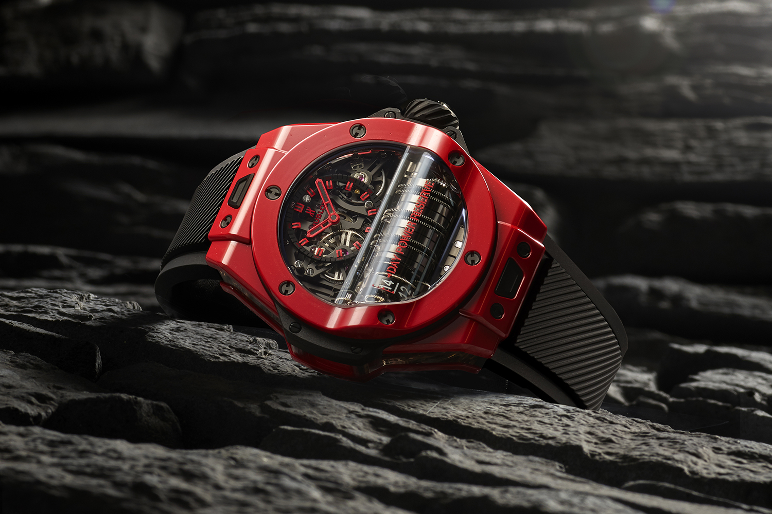 Корпус еще одной новой модели Big Bang MP-11 Red Magic впервые создан из высокотехнологичной керамики красного цвета, которую в лабораториях Hublot разработали еще в 2018 году – в действии этот инновационный материал можно было видеть в моделе Classic Fusion Richard Orlinski. И вот теперь красная полированная керамика обрамляет уже существоваший ранее мануфактурный оригинальный механизм HUB 9011 с семью заводными барабанами.