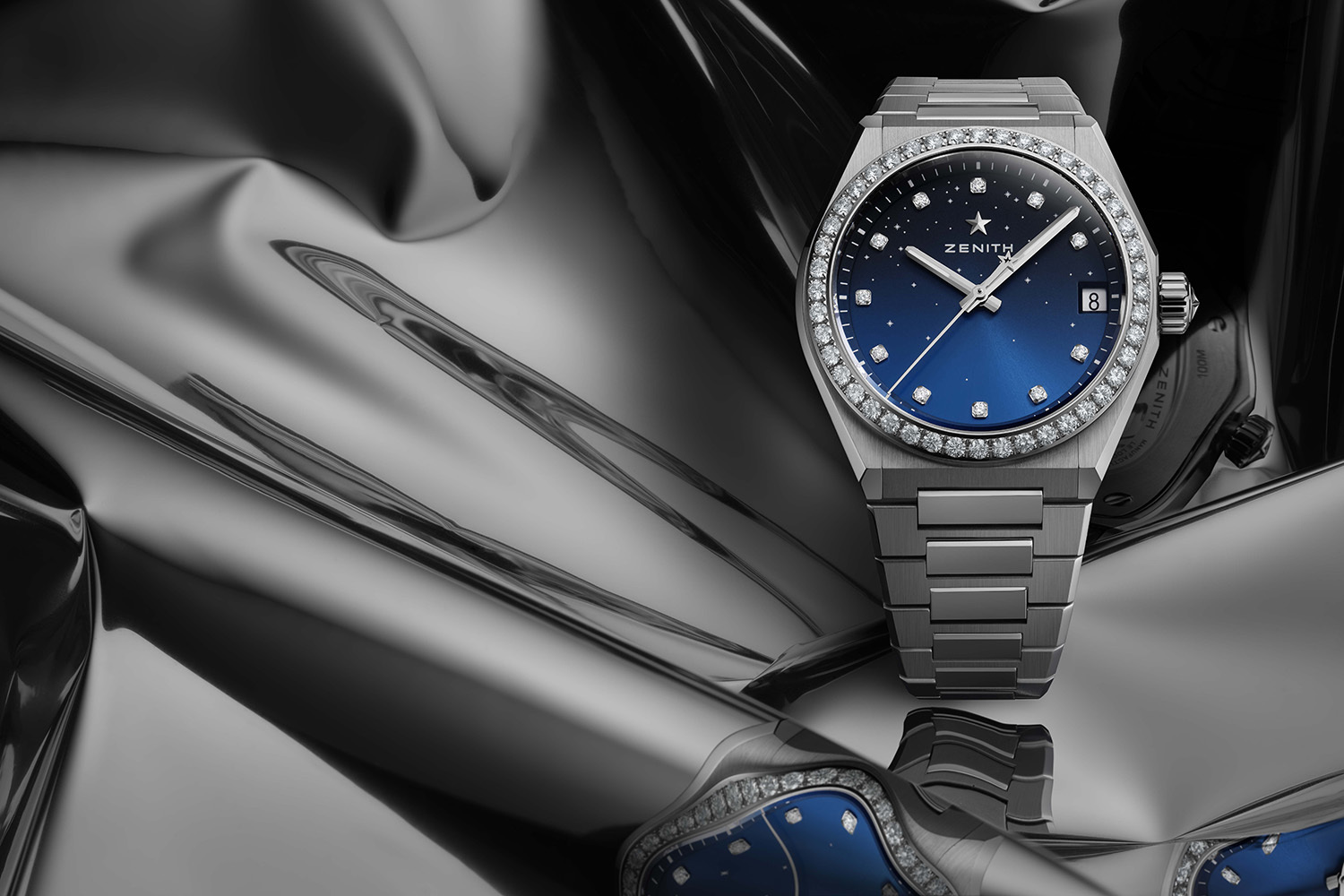 Женские часы стали главной среди новинок и у бренда Zenith: часы Defy Midnight – изящная, миниатюрная, но с харизматичным норовом версия мужских часов Defy, но вовсе не просто их уменьшенная копия. На темно-синем, сером или белом перламутровом циферблатах этих часов в 36-мм корпусе будто бы хаотично «разбросаны» мерцающие звезды – за этой романтической картиной скрывается сложнейшая техническая работа. Под этим «ночным небом» бьется мануфактурный калибр Elite с окошком даты на отметке «3 часа» и с 50-часовым запасом хода.