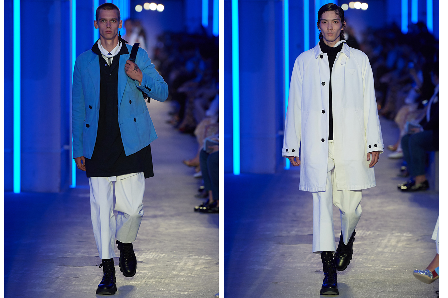 Подобный дуализм – вполне консервативная в своей основе одежда и нанизанное на нее бунтарство в виде функциональных и декоративных элементов – и является главным отличием нынешней коллекции. Если отрешиться от всех внешних деталей и взглянуть на любой предмет одежды по отдельности, то плащи, костюмы, ветровки, рубашки, шорты будут иметь традиционный крой. Бунтарским, футуристическим характером их награждают игра с пропорциями, порой радикальная; смелые сильнодействующие цветовые сочетаниями; создающая защитный эффект многослойность; высокотехнологичные ткани; яркие символичные принты и эмблемы.