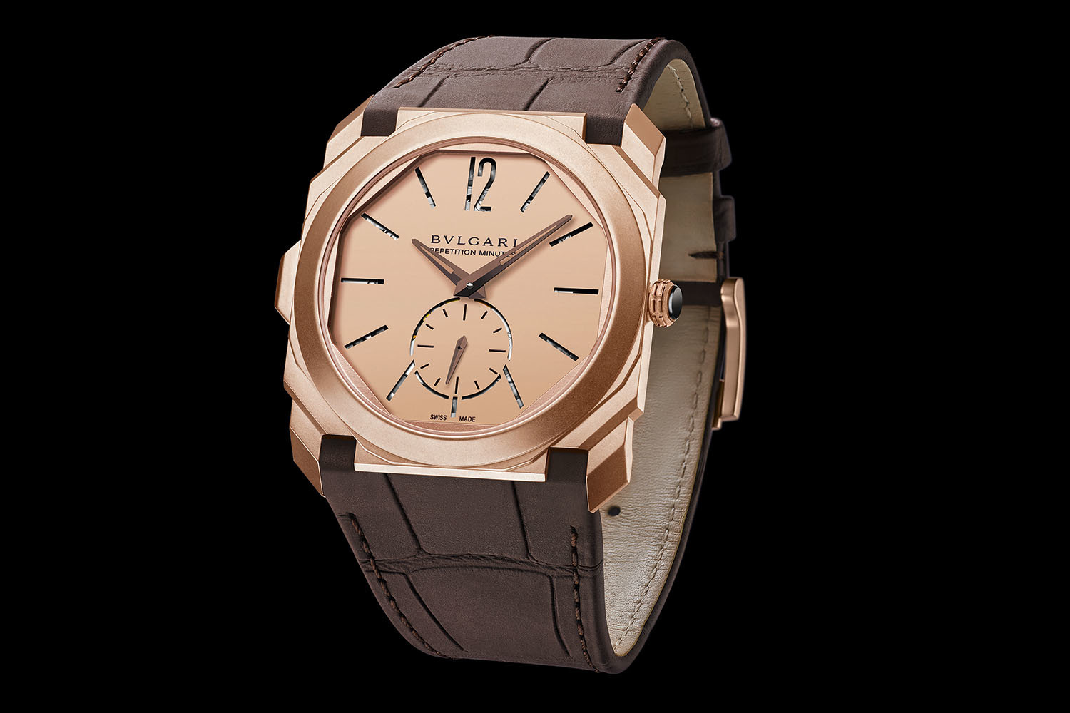 В главной мужской коллекции римского Дома, Octo Finissimo, представлено сразу пять новых моделей с новыми техниками отделки корпусов и деталей – комбинированной полированной и абразивно-струйной обработкой керамики и шлифованно-полированной обработкой стали и розового золота. Эти декоративно-технические приемы придают, казалось бы, уже привычному облику элегантных часов новое эстетическое восприятие. Самой интересной новинкой можно считать Octo Finissimo Minute Repeater с корпусом из розового золота, декорированного с применением абразивно-струйной обработки. Внутри модели установлен ультратонкий мануфактурный механический калибр BVL 362 с ручным заводом – его толщина составляет всего 3,12 мм. Этот свой мировой рекорд Bvlgari представили в 2016 году, но тогда часы были исполнены только из титана. Функция минутного репетира активируется нажатием кнопки напротив отметки «9 часов», устройство боя оснащено еще и предохранительной конструкцией «все или ничего». Кстати, часовые индексы и окно малой секунды на циферблате – прорезные, что усиливает резонанс звука внутри корпуса. При полном заводе запас хода этого экстраординарного механизма составляет 42 часа.