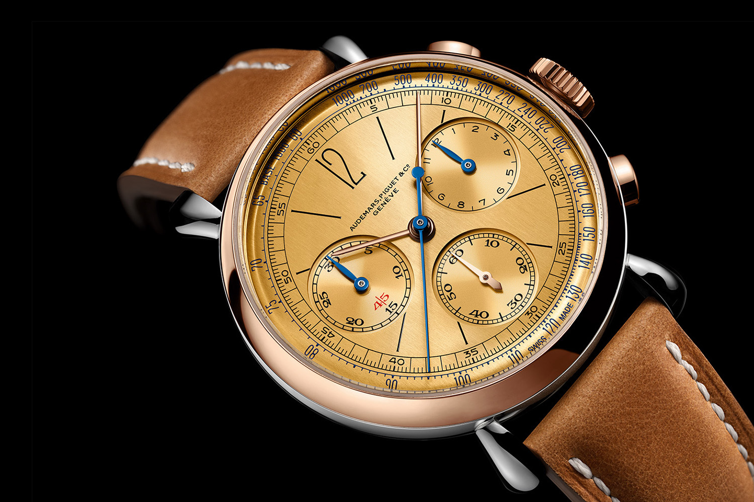 Часы [Re]master 01 мануфактуры Audemars Piguet – это интерпретация редкого наручного хронографа 1943 года, созданная с применением новейших технологий и актуальных дизайнерских решений. В круглом 40-миллиметровом корпусе двух тонов из стали и розового золота 750-й пробы воспроизводятся характерные черты дизайна оригинального хронографа 1533: каплевидные ушки подчеркивают закругления корпуса, а тончайший безель из розового золота открывает перспективу на отделку циферблата. Циферблат цвета шампань снабжен черными метками, часовой, минутной и секундной стрелками из розового золота, синей тахиметрической шкалой в технике деколь и счетчиками хронографа. За работу всех функций отвечает механизм с автоподзаводом последнего поколения – интегрированный хронограф с колонным колесом и функцией Flyback с запасом хода 70 часов.