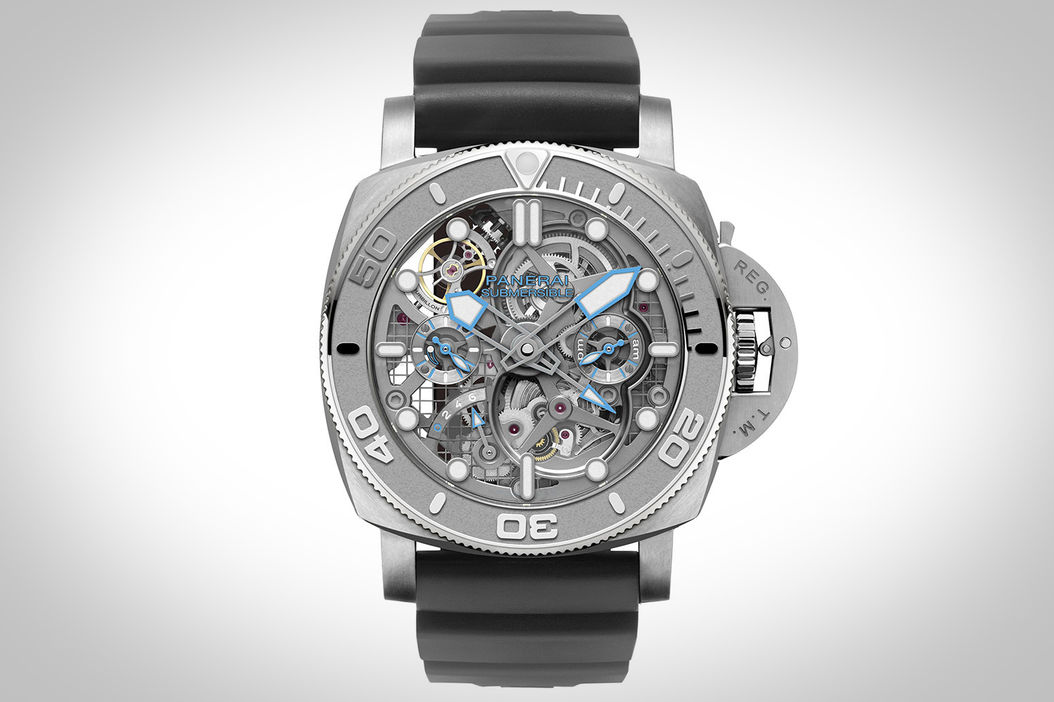 Наконечники стрелок, несколько индексов и надпись Panerai Submersible получили ярко-голубой «арктический» цвет, а на задней крышке выгравирован иллюминатор.