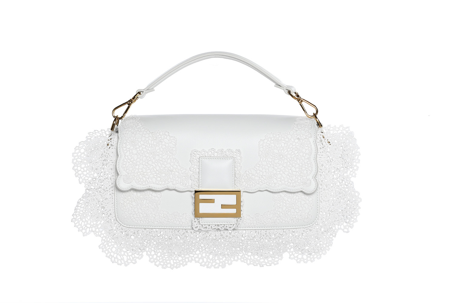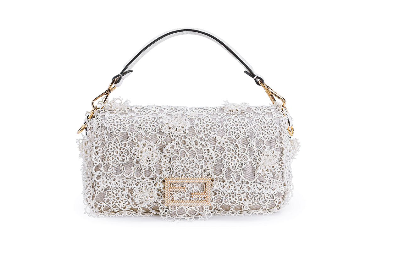 Три «багета» в проекте выполнены из кружева, но техники его плетения настолько разные, что и сумки отличаются друг от друга. Узоры плетеного кружева мастерской Dodino из деревни Нардо на юге Пульи создаются с помощью деревянных челноков – эта техника chiacchierino дает объемный концентрический орнамент и исполняется на льняной или хлопковой основе. Поверхность Baguette, словно в облаках, утопает в цветах, а ее пряжка декорирована речным жемчугом.