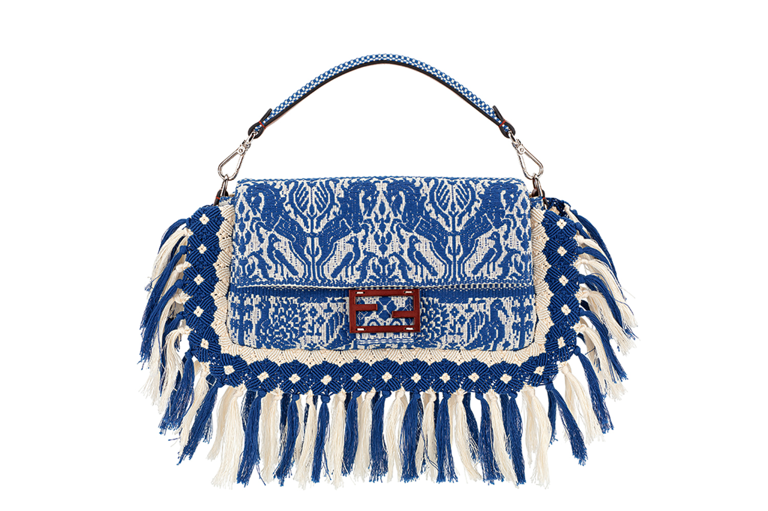 Еще одна тканая сумка Baguette была создана в мастерской Giuditta Brozzetti из города Перуджа региона Умбрия, в которой с 1921 года на ткацких станках XIX века воспроизводят декоративные исторические узоры. Во главе мастерской стоит Марта Броззетти, внучатая племянница основательницы, – именно она выбрала для Baguette историческую ткань в сине-белых тонах с витиеватым стилизованным узором с изображением лошадей, павлинов, единорогов и голубей. С трех сторон сумка декорирована плетением в технике макраме, и это тоже средневековый штрих.