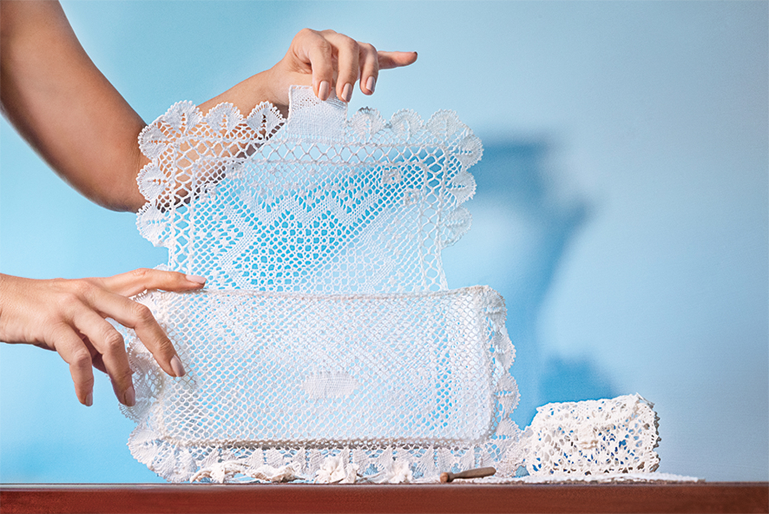 Городок Изерния на восточном побережье Италии известен как «столица кружева» региона Молизе. Из нитей цвета слоновой кости здесь плетут на деревянных катушках и цилиндрах геометрические узоры-спирали. По легенде, эту традицию в регион привезли в XVI веке монахини-бенедиктинки из Испании и передали ее сестрам церкви Santa Maria delle Monache. Для проекта hand in hand кружево было создано в мастерской GC Corredi и украсило поверхность Baguette из белой наппы.