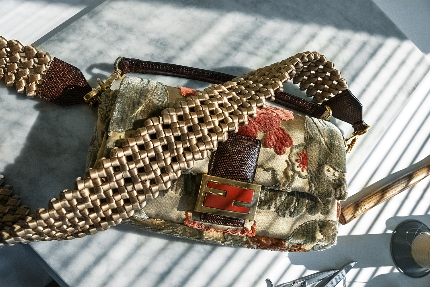 Ателье Veneto в сердце Венеции уже пять веков работает по архивам мастера Луиджи Бевилаквы. Рисунки жаккарда, парчи и шелка soprarizzo до сих пор повторяют старинные орнаменты, а исполняются на станках XVIII века – из такого бархатного жаккарда в коралловых и болотных тонах сшита сумка Baguette. Работа эта столь сложна, что за день изготавливают всего несколько сантиметров ткани. Пряжку FF украшает яшма, а ручку – кожа ящерицы.