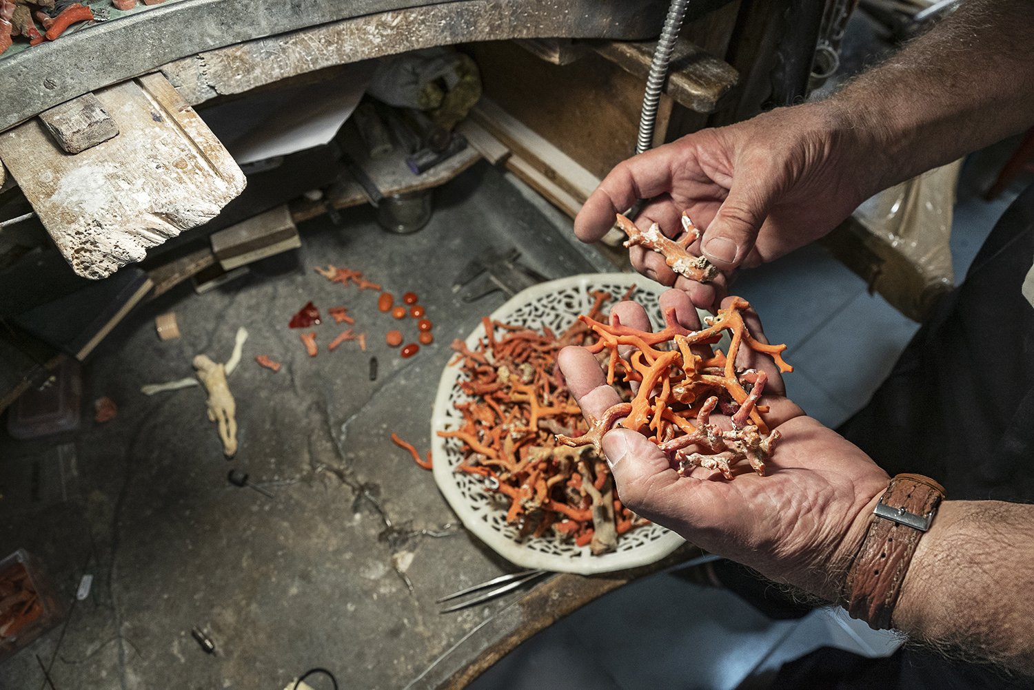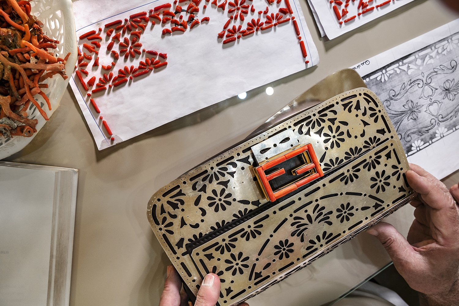 Последние две сумки из проекта напоминают драгоценные шкатулки. Ювелир Платимиро Фиоренца из местечка Трапани на Сицилии даже заслужил почетный статус ЮНЕСКО Living Human Treasures, или «культурного достояния», за свое искусство работы с красным кораллом, которое существует в регионе с XII века. Cвой Baguette он создал из панелей серебра, которые покрыты узором, и в него, уже в технике retroincasso, инкрустировал кораллы.