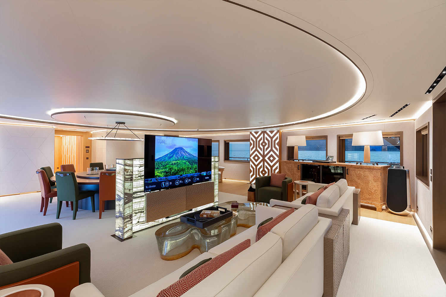 Роскошным интерьером судна с огромными панорамными окнами занимался российский дизайнер Василий Шприц из Санкт-Петербурга. Он же отвечал за интерьеры домов, входящих в Tinkoff Collection по всему миру. По словам Дарьи Тиньковой, директора по маркетингу и продажам La Datcha, у Василия каждый раз получается вдохнуть в проект частичку русской души.