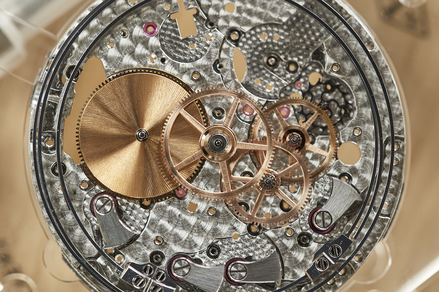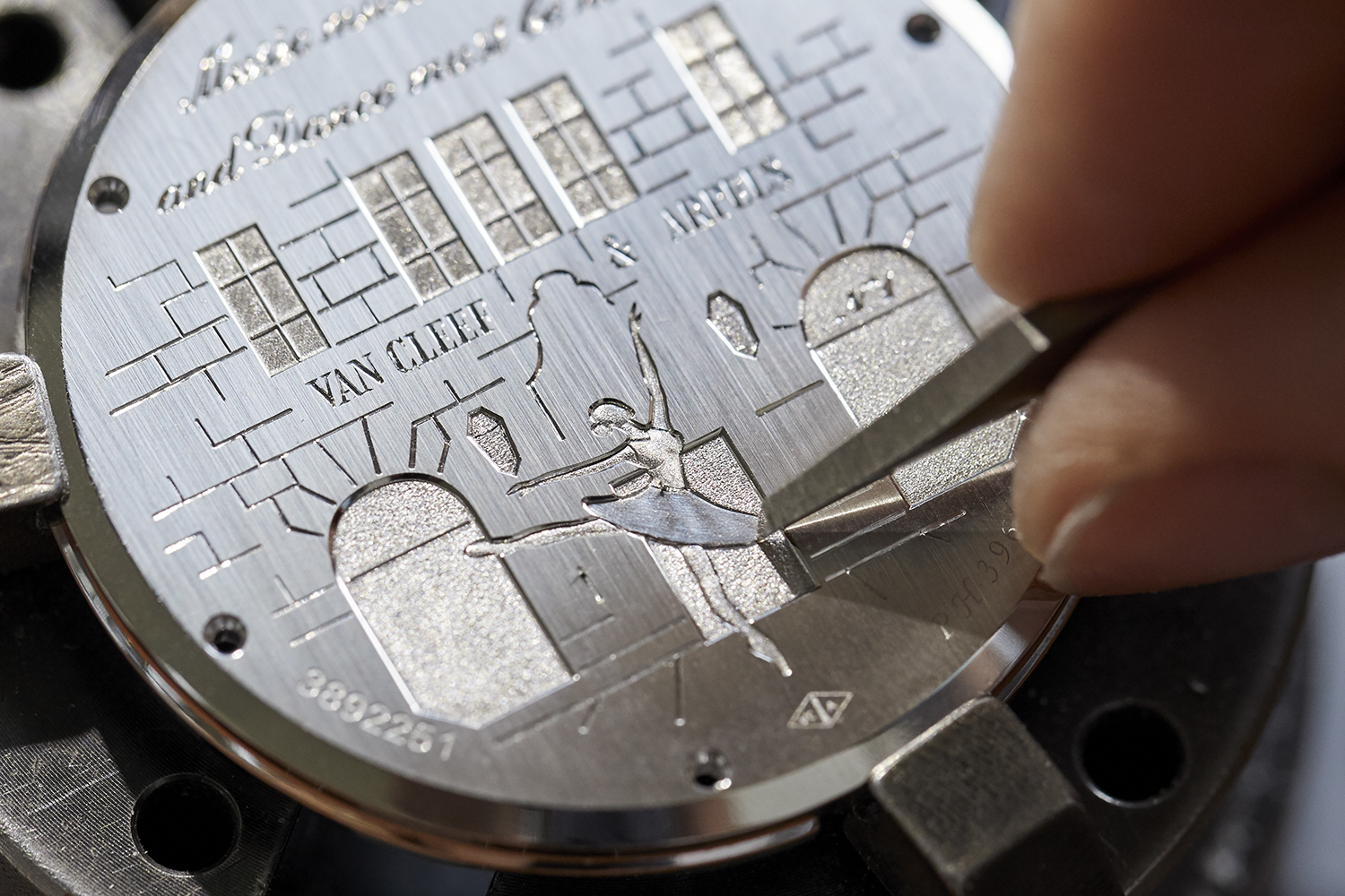 Повествование из мира танца продолжается и на задней крышке корпуса: на нее в технике гравировки нанесено барельефное изображение балерины, танцующей перед бутиком Van Cleef & Arpels на Пятой авеню в Нью-Йорке, где в 1966 году состоялась знаковая встреча Клода Арпельса и Джорджа Баланчина и родилась идея балета «Драгоценности».