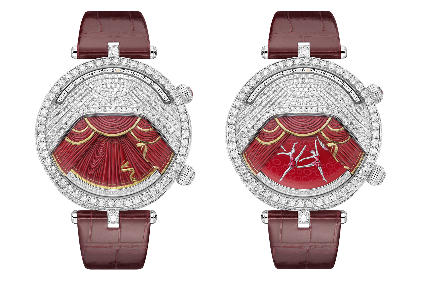 Художники-миниатюристы и ювелиры Дома создали на циферблате трехмерную композицию в виде театральной сцены: ее верхняя, инкрустированная паве из бриллиантов часть изображает сияющую люстру и роскошный парадный занавес. Ниже в технике ручной миниатюрной живописи созданы уже декорации и занавес самого спектакля «Драгоценности» и сцена, на которой застыли в танце изящные фигурки балерин. В вариации модели Lady Arpels Ballerine Musicale Rubis, или акта «Рубины», исполненной в оттенках красного, танцовщиц – две, точно так же как и в модели Lady Arpels Ballerine Musicale Émeraude, он же запечатленный акт «Изумруды», а вот в третьей модели, Lady Arpels Ballerine Musicale Diamant, или в акте «Бриллианты», – парящих на синем фоне фигурок уже три.