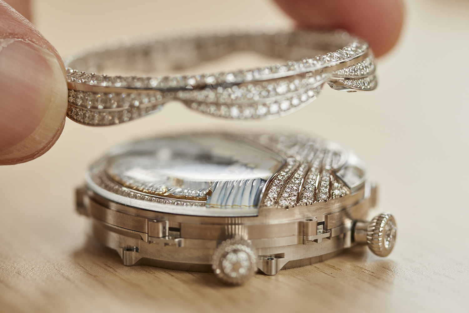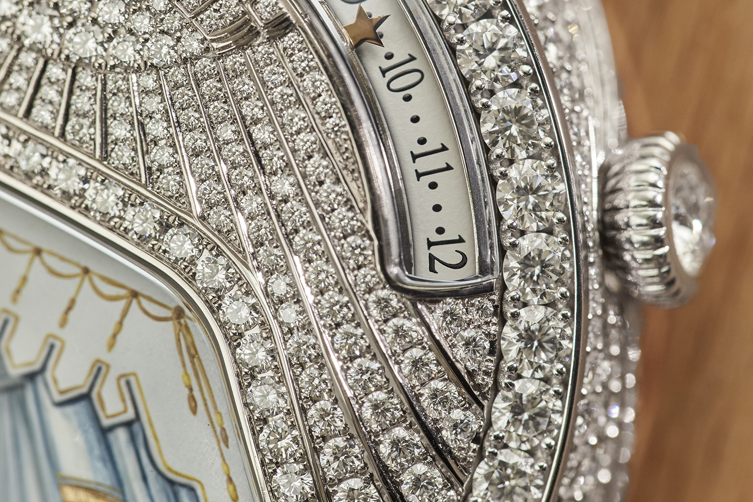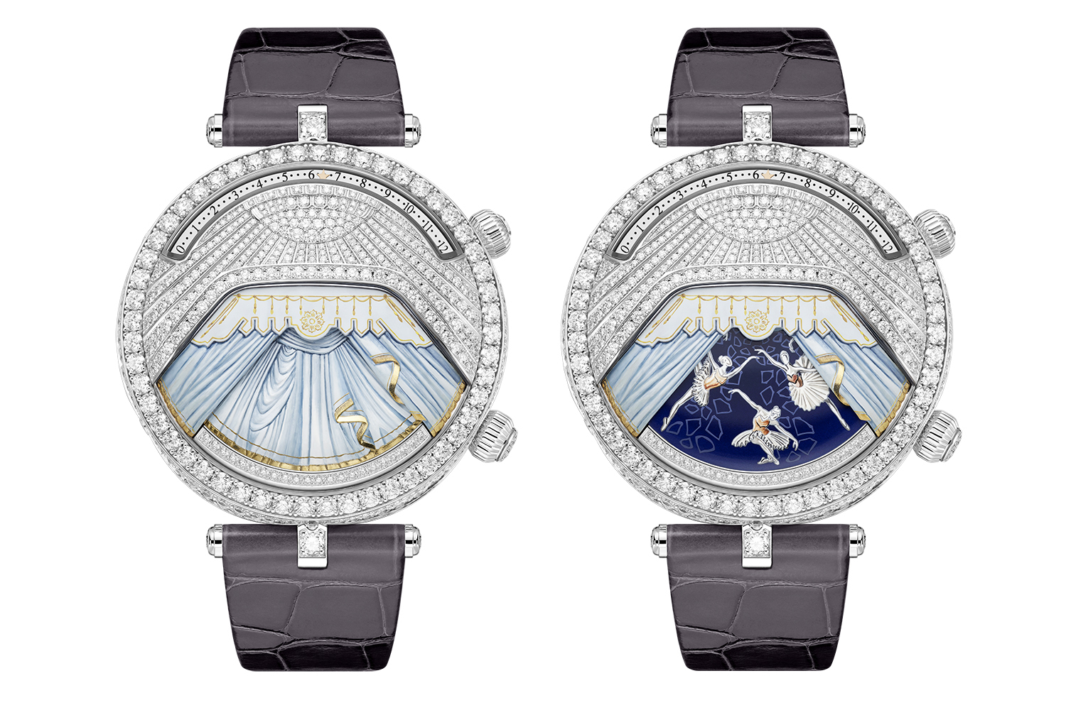 А вот идея воплощения этого балета на циферблате возникла в Van Cleef & Arpels более десяти лет назад – семь лет из них потребовалось инженерам и часовщикам Дома на разработку и реализацию калибра с ручным подзаводом, приводящего в действие по требованию и анимированный модуль, и карильон с музыкальной шкатулкой. Более того, мастера дополнили часы еще функцией ретроградной индикации времени: в верхней части, над бриллиантовым занавесом, расположена 12-часовая шкала – время на ней указывает золотая звездочка, символизирующая звезд Парижской оперы.