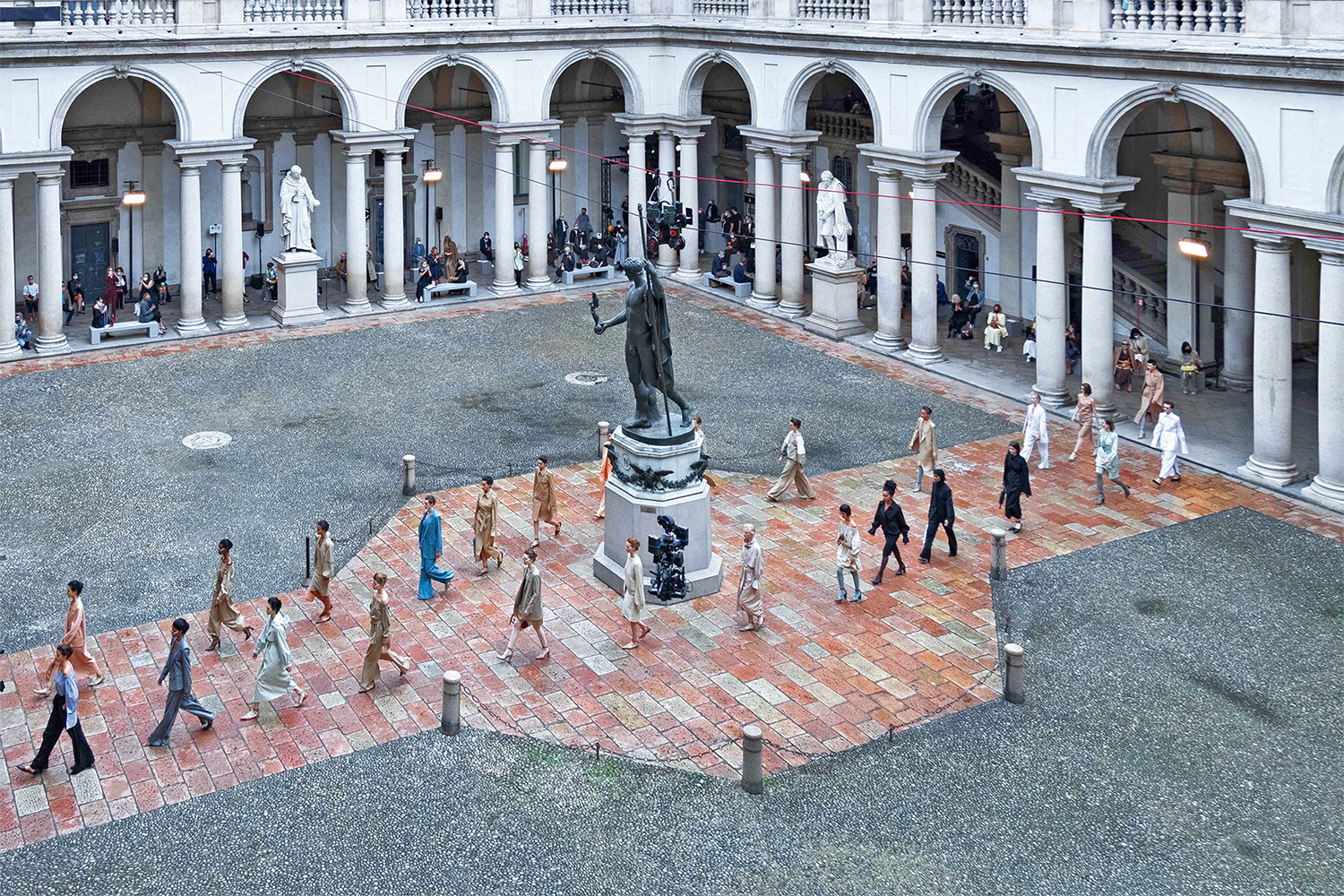 Показ Max Mara весна-лето 2021 проходил в миланской академии изящных искусств Brera – во дворце, построенном, правда, уже в эпоху Просвещения, при императрице Марии Терезии. Однако в академии имеется пинакотека, в которой представлены картины Рафаэля, Мантеньи, Тинторетто, Лоренцо Лотто и других представителей Ренессанса. В такой атмосфере, среди величественных колонн и арок, чеканя шаг по каменному полу, модели демонстрировали предметы новой коллекции: тренчи, пальто и пиджаки с длинными разрезами на рукавах или с атласными рукавами-баллонами, костюмы цвета неба и песка, комбинезоны с присборенным декольте, развевающиеся шелковые платья, микросумки-конверты.