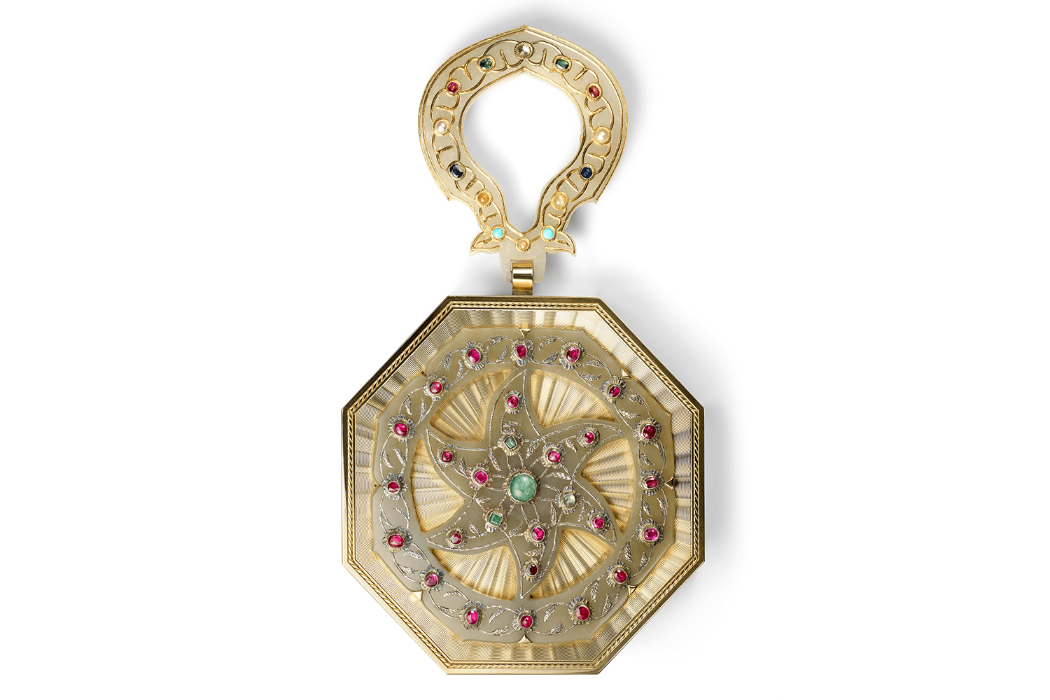 Все арт-объекты объединяют те же резьба по природному материалу, обрамление из золота и декор из эмали, пусть и выполненные в разной стилистике. Драгоценный сосуд-ароматник для розовой воды XVII века работы мастеров северной Индии, некогда подаренный императрице Анне Иоанновне посольством Надир-шаха, выполнен из серебра и золота с инкрустацией рубинов, изумрудов, жемчуга и алмазов в технике кундан. Подобрать к этому артефакту предметы из коллекции Cartier было также несложно: в начале XX века клиентами Дома были индийские махараджи, и для них создавались изделия в национальной манере с легким европейским налетом. Именно так родился ювелирный стиль Cartier Tutti Frutti в резными драгоценными камнями на индийский манер – браслет и две броши в этом стиле представлены в витрине с ароматником наряду с несессером наследницы Дейзи Феллоуз и прочими восточными по виду предметами Cartier.