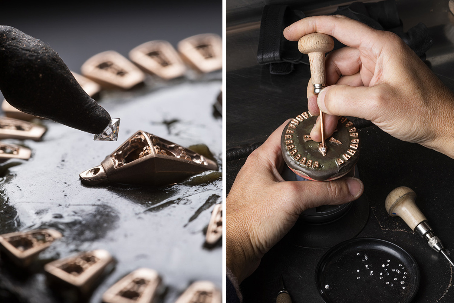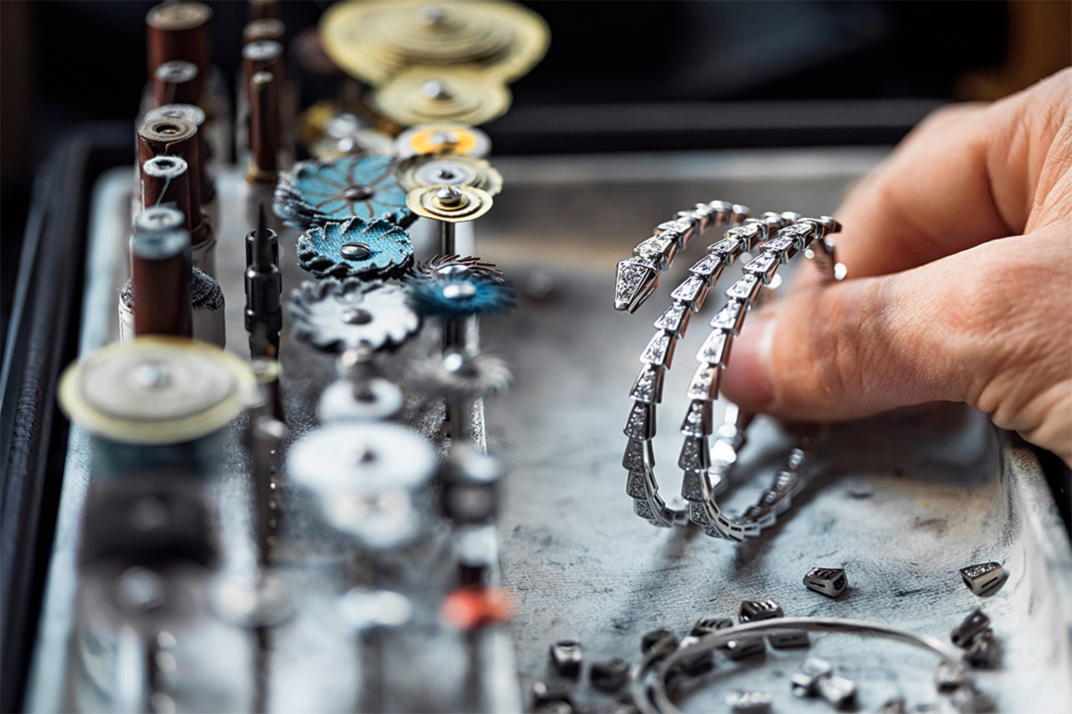 Предварительно еще каждая такая чешуйка должна пройти через руки закрепщика драгоценных камней, который вставит в нее бриллианты – по два камня круглой огранки в каждую. И как при отливке и шлифовке золотых чешуек, важно до миллиметра соблюсти точность их размера, чтобы элементы как влитые вошли один в другой, ибо и бриллианты должны быть закреплены так, чтобы не помешать составлению модульной конструкции.