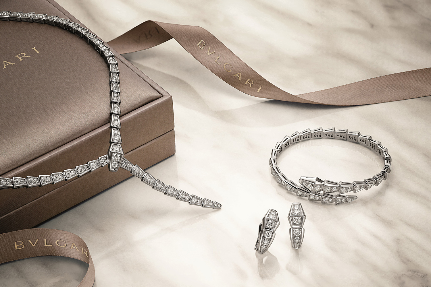 С тех пор древний тотем постепенно стал плотью от плоти Bvlgari и даже символом Дома, но при этом непрестанно эволюционировал. За минувшие десятилетия образ змеи, «пригретой» на шее, на запястье и фалангах пальцев, трактовался дизайнерами Bvlgari десятки раз: начиная с 60-х годов неоднократно принимал новый облик в украшениях, постепенно «переползал» в парадные драгоценности high jewellery, сливался воедино с еще одним фирменным мотивом – Tubogas, демонстрировал свою драгоценную шкуру в часах...