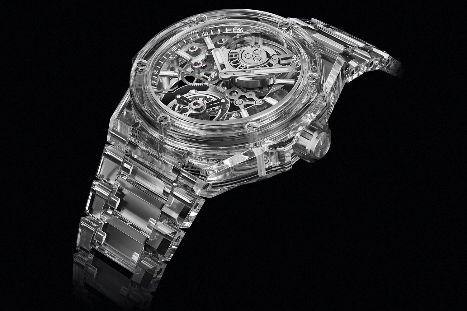 Hublot, единственный из часовых брендов, чьи эксперименты с таким сложным и капризным материалом, как сапфировое стекло, завершились созданием собственного мануфактурного производства, теперь довел концепцию прозрачных часов до абсолюта. Уже не только корпус Big Bang Integral Tourbillon Full Sapphire, но и интегрированный браслет полностью выполнены из сапфирового стекла. Таким образом, это первые в мире полностью прозрачные часы. Создание гибкого инновационного браслета с 22 компонентами из сапфира и титановыми вставками потребовало особых разработок. В новом автоматическом мануфактурном калибре HUB6035 мастера Hublot избавились практически от всех видимых винтов и переосмыслили дизайн платины и прозрачных мостов турбийона из сапфира так, чтобы создать иллюзию, что они «парят» в воздухе или на запястье вместе с корпусом и браслетом.