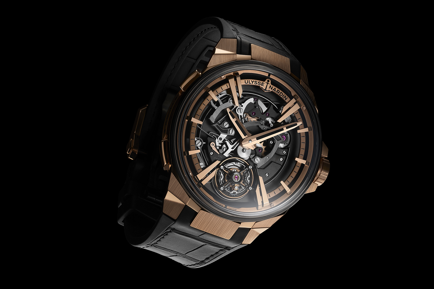 В часах Blast Hourstriker инженеры Ulysse Nardin применили инновационную технологию боя, преодолевающую «звуковой барьер». Решив усилить соотношение качества звука и его выходной мощности, они разработали калибр UN-621, первый мануфактурный механизм с автоподзаводом и боем, а заодно и парящим турбийоном. И так пересмотрели кинематику его 330 деталей, чтобы работа механизма была видна на скелетонизированном циферблате. В его оформлении отчетливо читается литера X – символ, который теперь ассоциируется с последним поколением творений бренда.