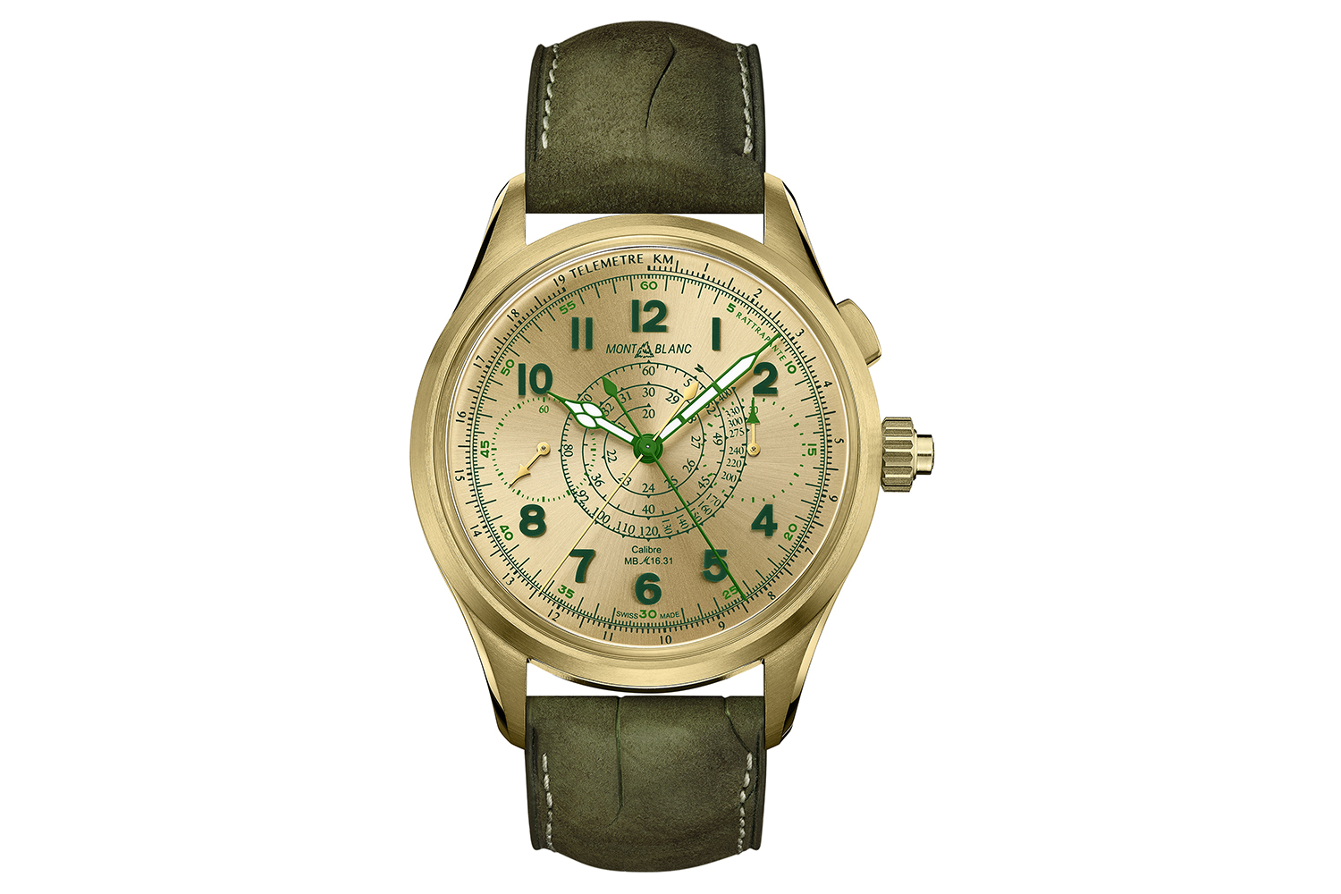 Часы Montblanc 1858 Split Second Chronograph LE18 (Lime Gold) – интерпретация исторических 46-миллиметровых армейских хронографов Minerva, теперь принадлежащей Montblanc мануфактуры. Круглый корпус диаметром 44 мм создан из особого сплава Lime Gold с характерным лаймовым, или желто-зеленым оттенком, который только усиливает винтажный облик модели. Этот инновационный сплав на 75% состоит из 18-каратного золота, на 23,8% из серебра и на 1,2% из железа. На циферблате того же оттенка можно видеть и тахиметрическую шкалу-улитку по центру, которая присутствовала в историческом прототипе, а также телеметрическую по внешнему краю. Накладные арабские цифры, контур кафедральных стрелок, сплит-секундная стрелка и все прочие индексы выполнены здесь из люминесцентного состава Super-LumiNova насыщенного зеленого цвета, что оттеняет сплав Lime Gold и гармонирует с зеленоватым «потертым» ремешком. Управляет однокнопочным сплит-хронографом мануфактурный механизм MB M16.31 с ручным заводом. Каждые из 18 экземпляров этих часов удостоены фирменного сертификата качества Montblanc Laboratory Test 500.
