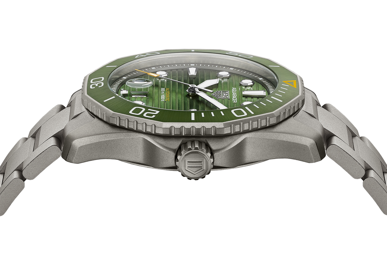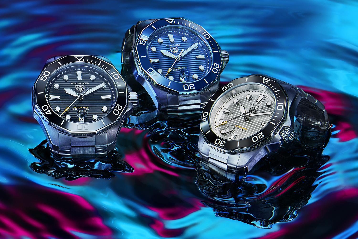 Обновление Aquaracer, существующей сорок лет коллекции спортивных дайверских часов TAG Heuer, получило новое дополнительное название Aquaracer Professional 300. Дизайнеры бренда стремились создать выразительный, эргономичный и высокофункциональный объект и начали с фирменного двенадцатигранного фацетированного безеля Aquaracer: дополнили его керамическими вставками так, чтобы можно было браться и вращать за любую грань, и доработали поворотный механизм до плавного и бесшумного хода. Над окошком даты на отметке «6 часов» внутри сапфирового стекла появилось увеличительное, и теперь ее проще считать. Новые мечеобразная часовая и более тонкая минутная стрелки теперь хорошо отличимы друг от друга еще и благодаря люминесцентному покрытие Super-LumiNova разных цветов – зеленого и синего. Также была улучшена защита заводной головки и оснащен механизмом точной регулировки металлический браслет. Часы с автоматическим механизмом Calibre 5 представлены в шести вариациях из стали, и на обратной стороне их корпусов диаметром от 36 до 43 мм красуется, как и предыдущие 17 лет в этой коллекции, изображение водолаза в винтажном шлеме. Одна из моделей, Aquaracer Professional 300 Tribute to Ref. 844, посвящена исторической модели 1978 года и выпущена в количестве 844 экземпляров.