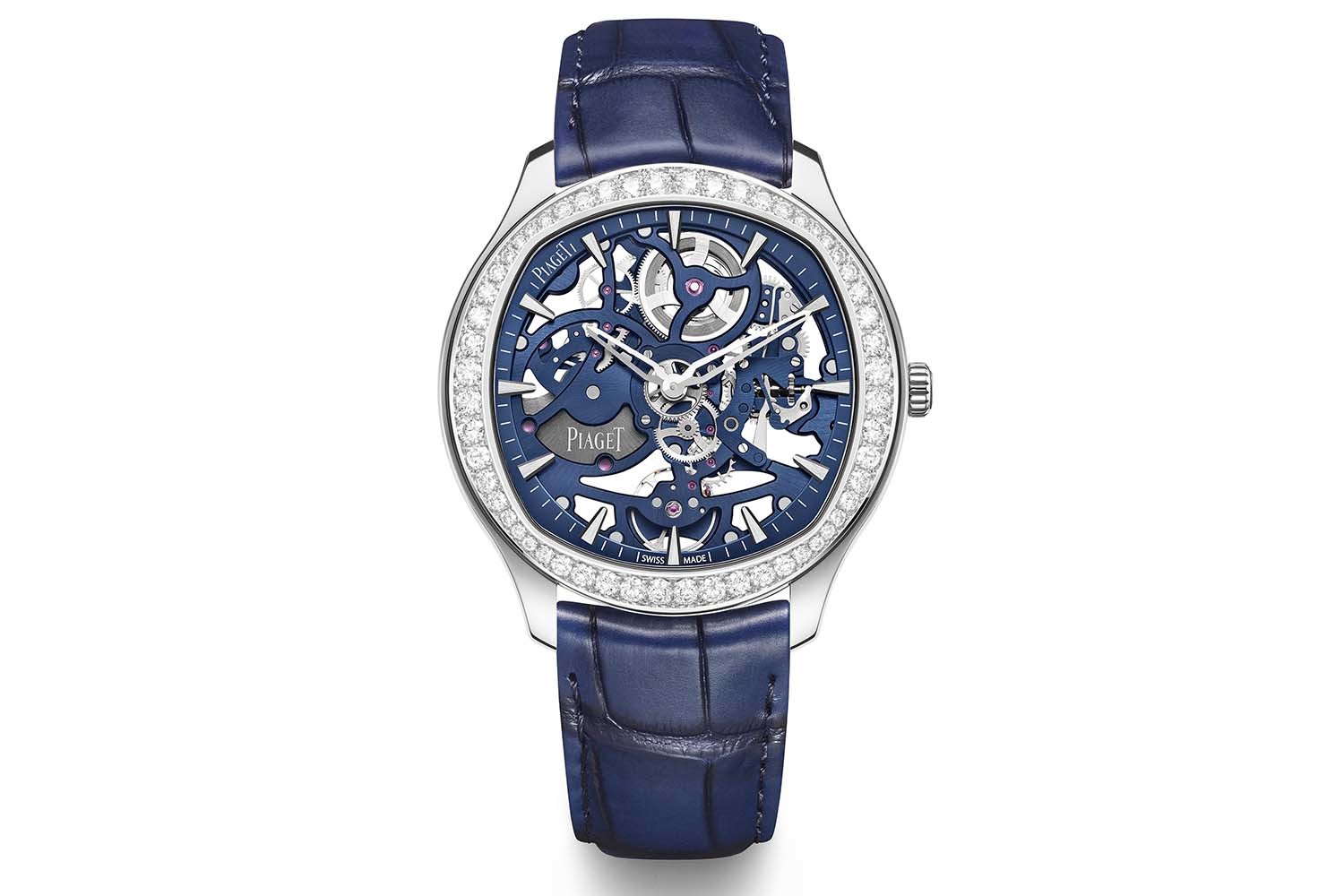 Впервые в знаковой для бренда коллекции Polo часовщики Piaget представили версии со скелетонизированными механизмом и циферблатом. Сначала из стали, а уже во время W&W 2021 – четыре вариации из золота в корпусе диаметром 42 мм и высотой 6,9 мм. В двух моделях Piaget Polo Skeleton из белого и желтого золота ажурная структура автоматического калибра 1200S1толщиной 2,4 мм получила ярко-синее PVD-покрытие, что сразу придает моделям экстравагантный современный вид. Еще в одной версии из белого золота все элементы механизма усыпаны бриллиантами, впрочем, как и корпус, безель и фланец корпуса, – всего 472 драгоценных камня. И, наконец, в четвертой версии бриллиантами огранки «багет» и круглой огранки инкрустирован уже золотой браслет, и она справедливо может посоперничать в борьбе за звание и женской модели.