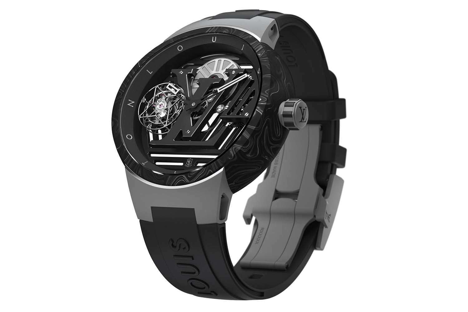 Двадцатилетие самых первых своих часов Tambour Дом Louis Vuitton отмечает несколькими новинками в данной коллекции, одна из которых – Tambour Curve GMT Flying Tourbillon. Интерпретация механизма парящего турбийона с функцией индикации времени во втором часовом поясе получила футуристический, высокотехнологичный облик. Корпус диаметром 46 мм создан из титана и из инновационного материала Carbostratum и дополнен деталями из белого золота. В скелетонизированном графичном циферблате читаются литеры LV, а на каретке парящего турбийона на отметке «9 часов» угадывается графичный цветок Monogram.