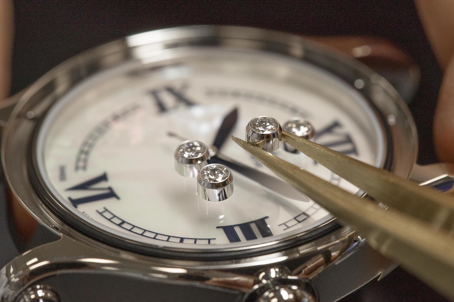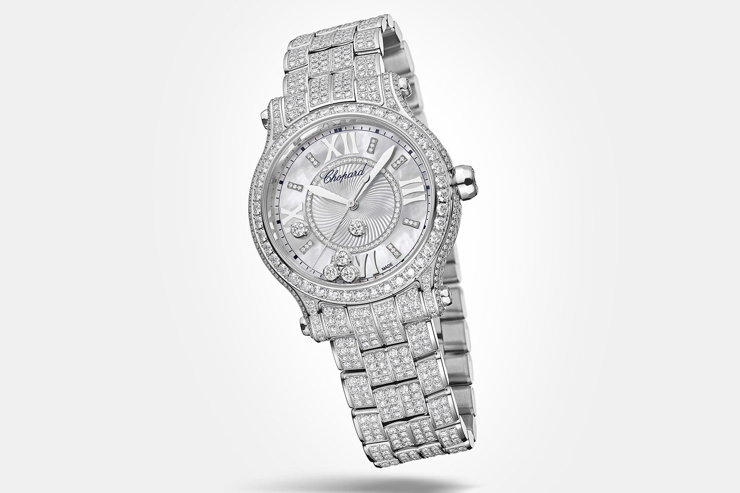 Разумеется, на серебристом циферблате с гильошированным узором или перламутровом циферблате кружатся в танце знаменитые «плавающие» бриллианты. При сборке часов опытные мастера должны расположить каждый из пяти драгоценных камней в капсуле, имеющей форму волчка, особым образом – так, чтобы между двумя сапфировыми стеклами не возникало никаких препятствий для их нескончаемого свободного движения.