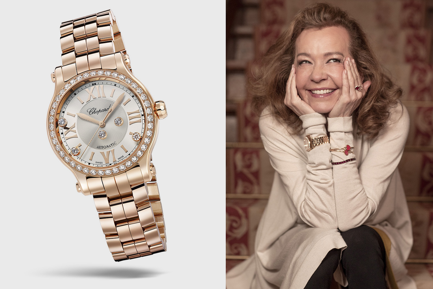 Разумеется, Джулия Робертс источает флюиды жизнерадостности тоже не просто так – для союза с большой звездой есть весомый повод: обновление Happy Sport. Впервые за свою богатую историю преображений знаковая модель создана в корпусе диаметром 33 мм – и этот оптимальный для женского запястья размер просчитан по правилу золотого сечениия. По нему же пропорции корпуса сочетаются с расположенным в нем мануфактурным автоматическим механизмом Chopard 09.01-C диаметром 20,4 мм с 42-часовым запасом хода. Безукоризненно им вторит гибкий и эргономичный браслет с четырьмя рядами звеньев, напоминающих гальку.