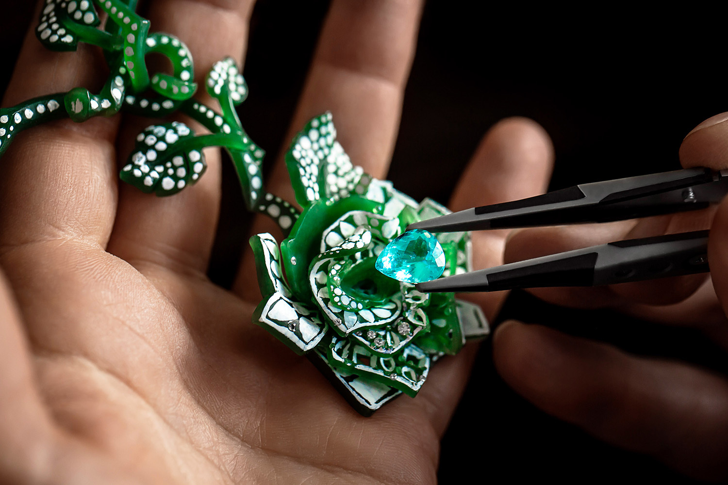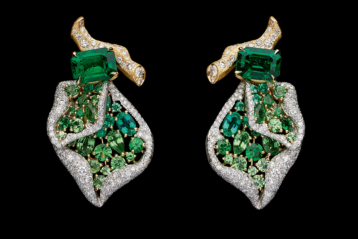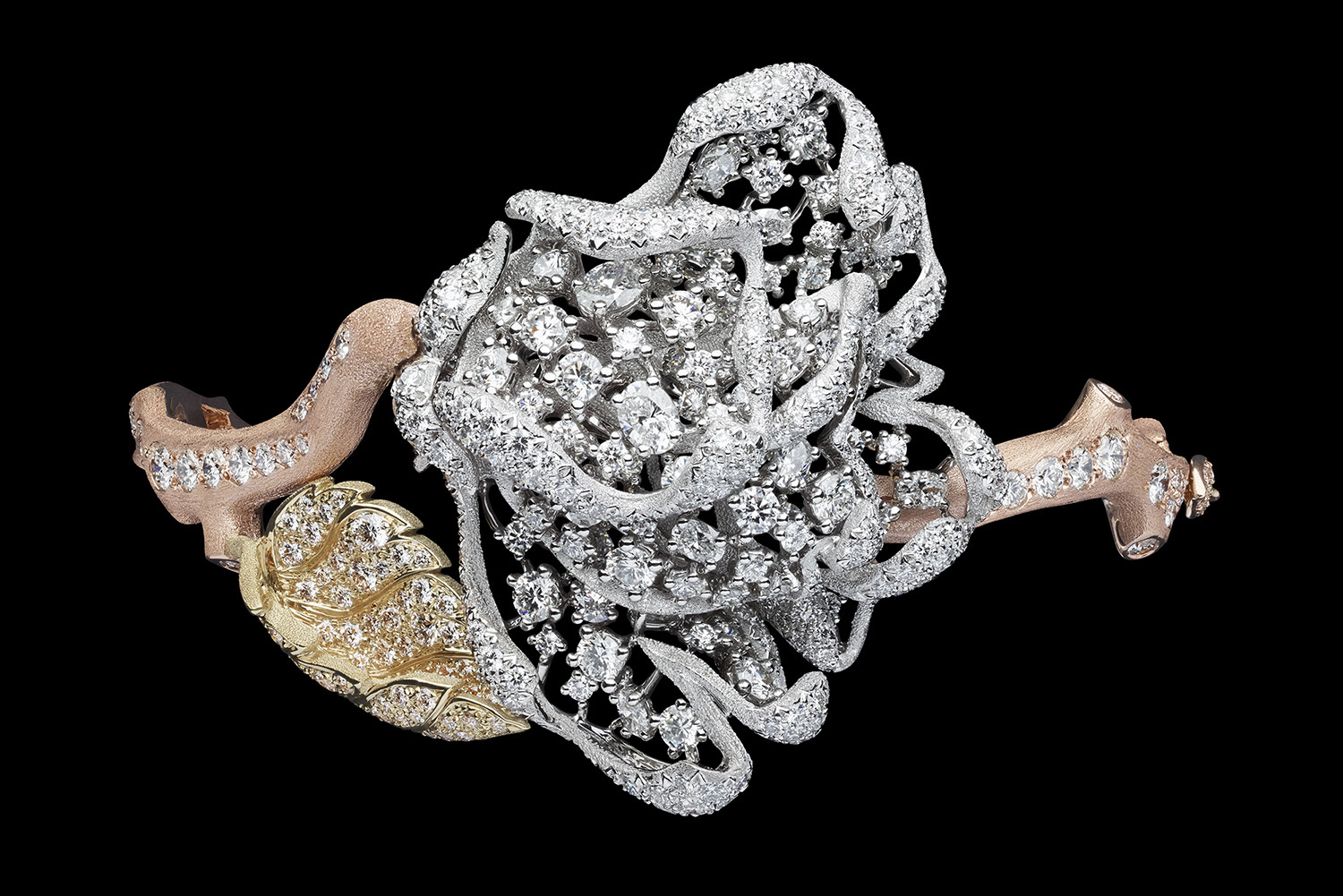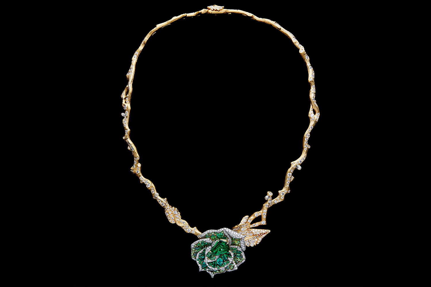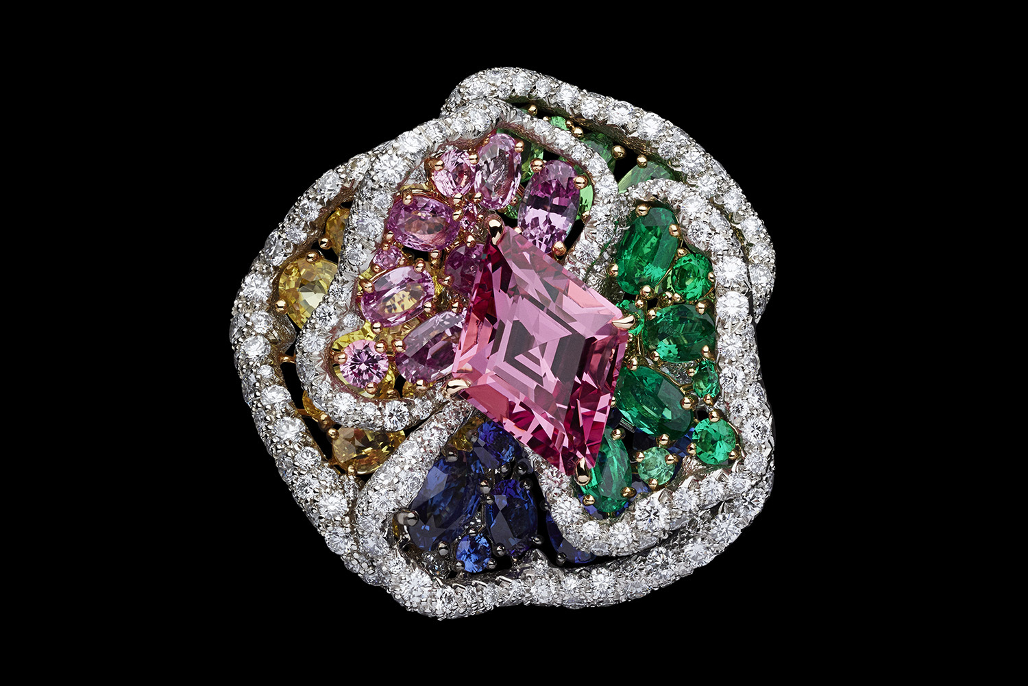 Кроме сказочной синей розы, в саду Dior цветет и зеленая с замбийскими изумрудами и цаворитами, и белоснежная, целиком выполненная из бесцветных бриллиантов, и розовая, всех оттенков шпинели, и золотая – с сияющими желтыми бриллиантами. Большинство из них задуманы как части трансформеров, способных меняться по настроению хозяйки или по необходимости.