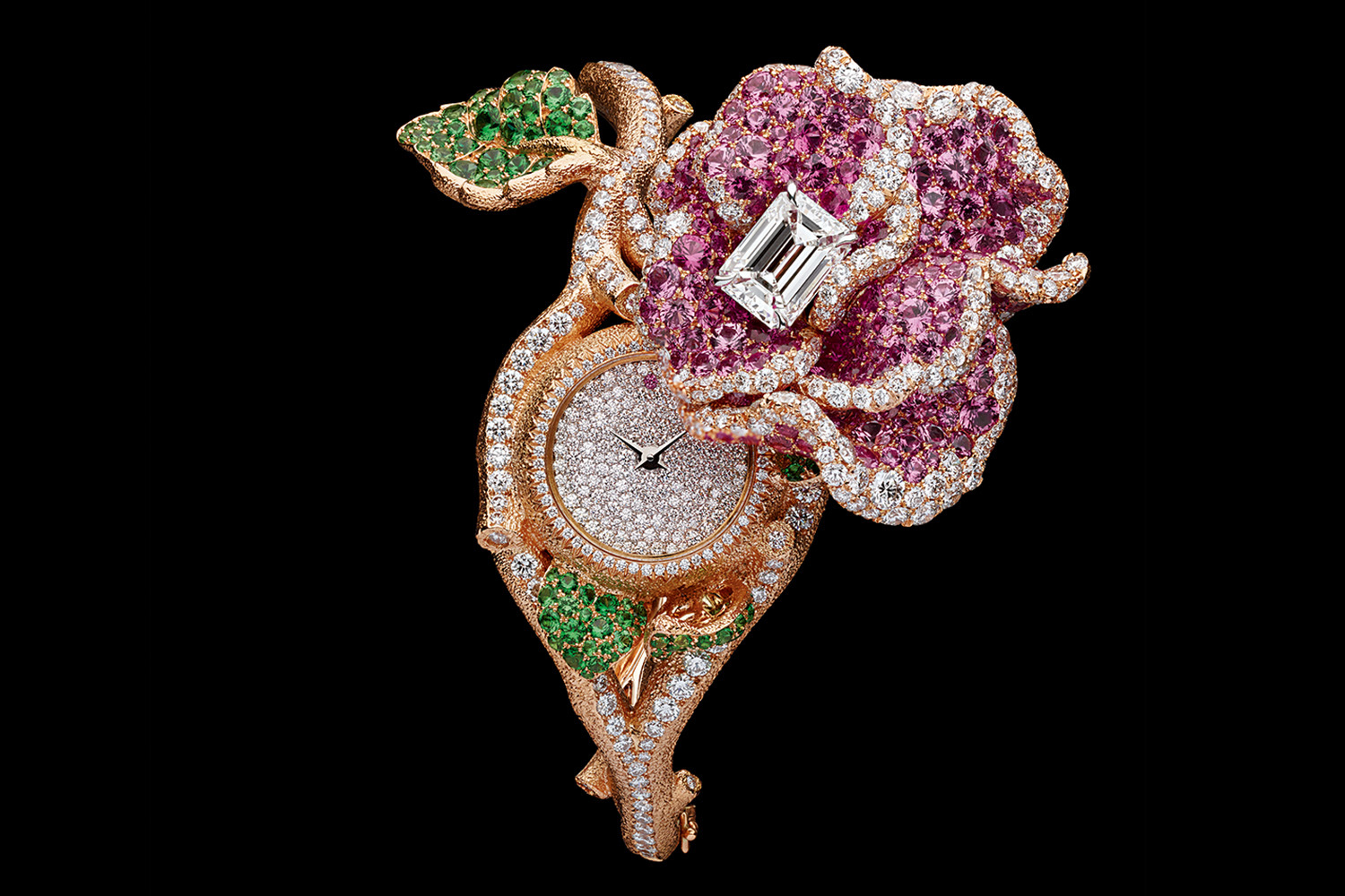 Не забыла Виктуар и про часы с едва распустившимся розовым цветком и с контрастным зеленым листочком сбоку. Он, кстати, выполняет функцию рычага, благодаря которому можно отодвинуть верхнюю секретную часть и взглянуть на циферблат. «В прошлой коллекции я ставила перед собой сложную и увлекательную задачу: передать хрупкость в камне и золоте, – рассказывает Виктуар. – А сейчас решила пойти дальше и добавить украшениям максимальную созвучность реальности. Мне кажется, такой подход соответствует духу нашего времени, в котором меняется все, кроме искренней любви к природе». Дизайнер знает, о чем говорит: за время карантина она так скучала по живым цветам, что нарисовала на белых стенах своей парижской квартиры буйные джунгли.