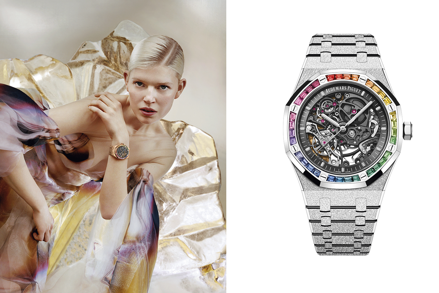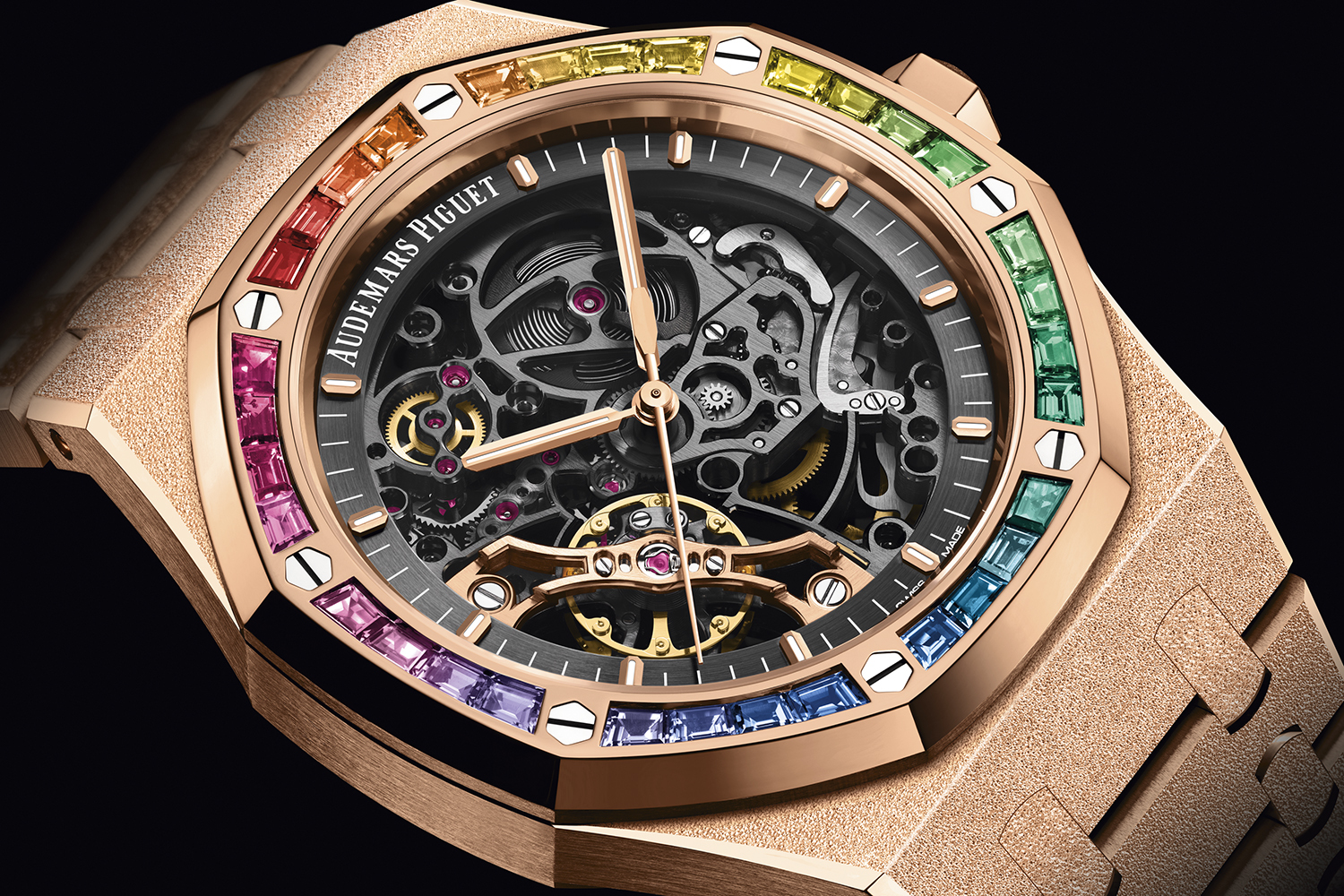 Корпус и браслет декорированы все в той же ювелирной технике Frosted Gold, которая идеально подчеркивает безель, украшенный радугой из драгоценных камней. Тридцать два драгоценных камня багетной огранки – рубины, цавориты, изумруды, топазы, танзаниты, аметисты и цветные сапфиры – имеют общий вес 1,91 карата и впечатляют плавным переходом оттенков. Это деграде делает акцент на восьмиугольной форме безеля и одновременно оптически возвышает открытый взору скелетонизированный мануфактурный калибр 3132 с двойным балансом.