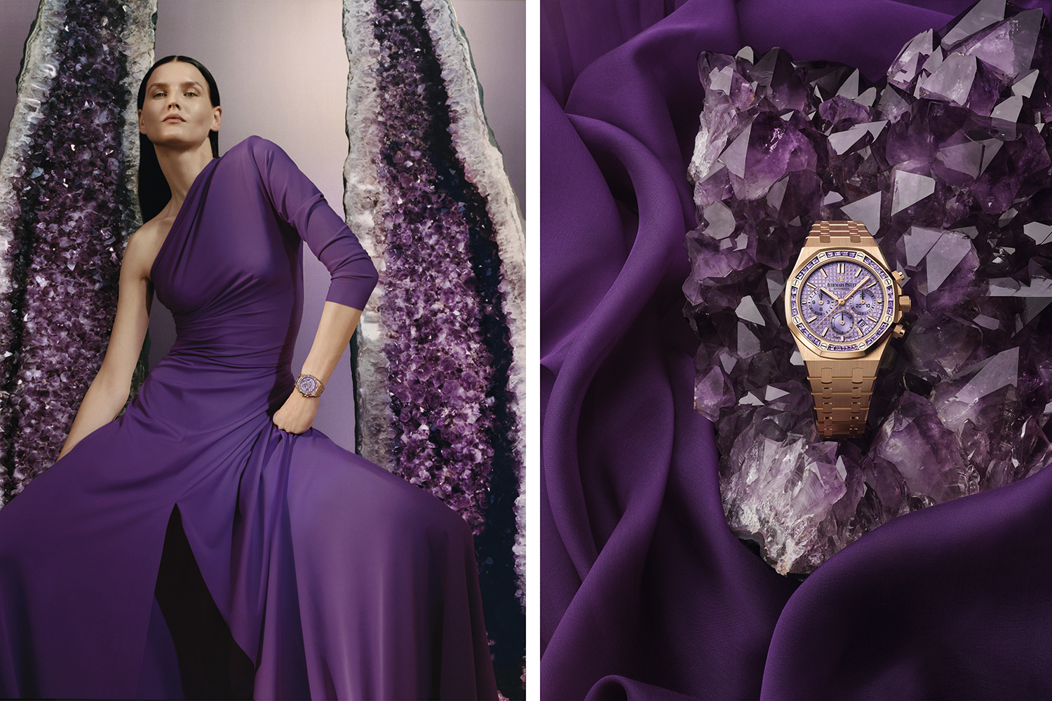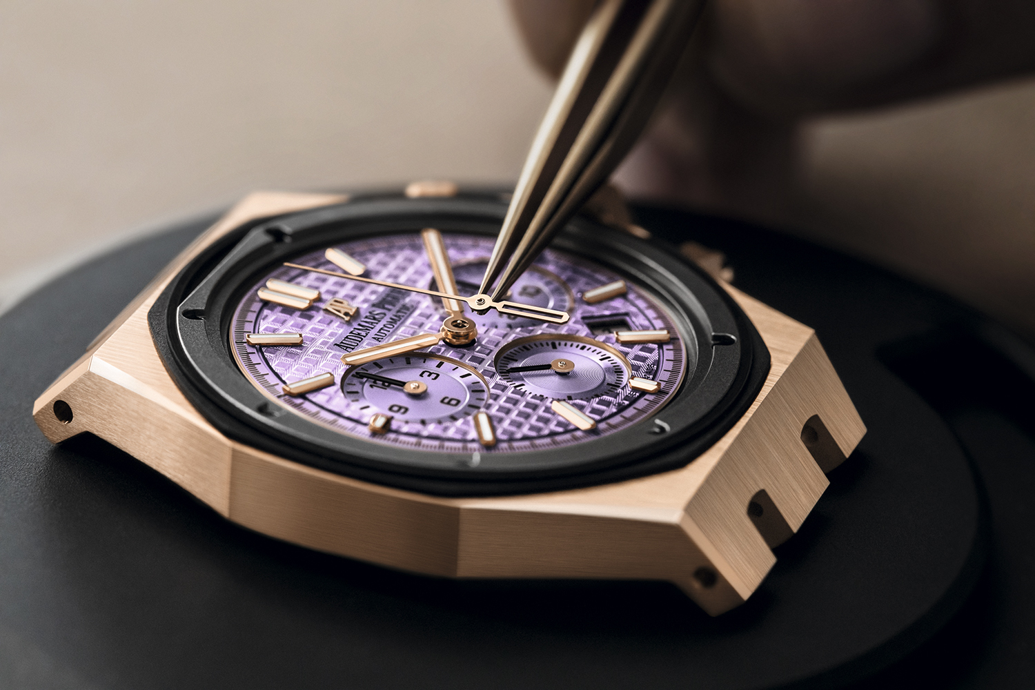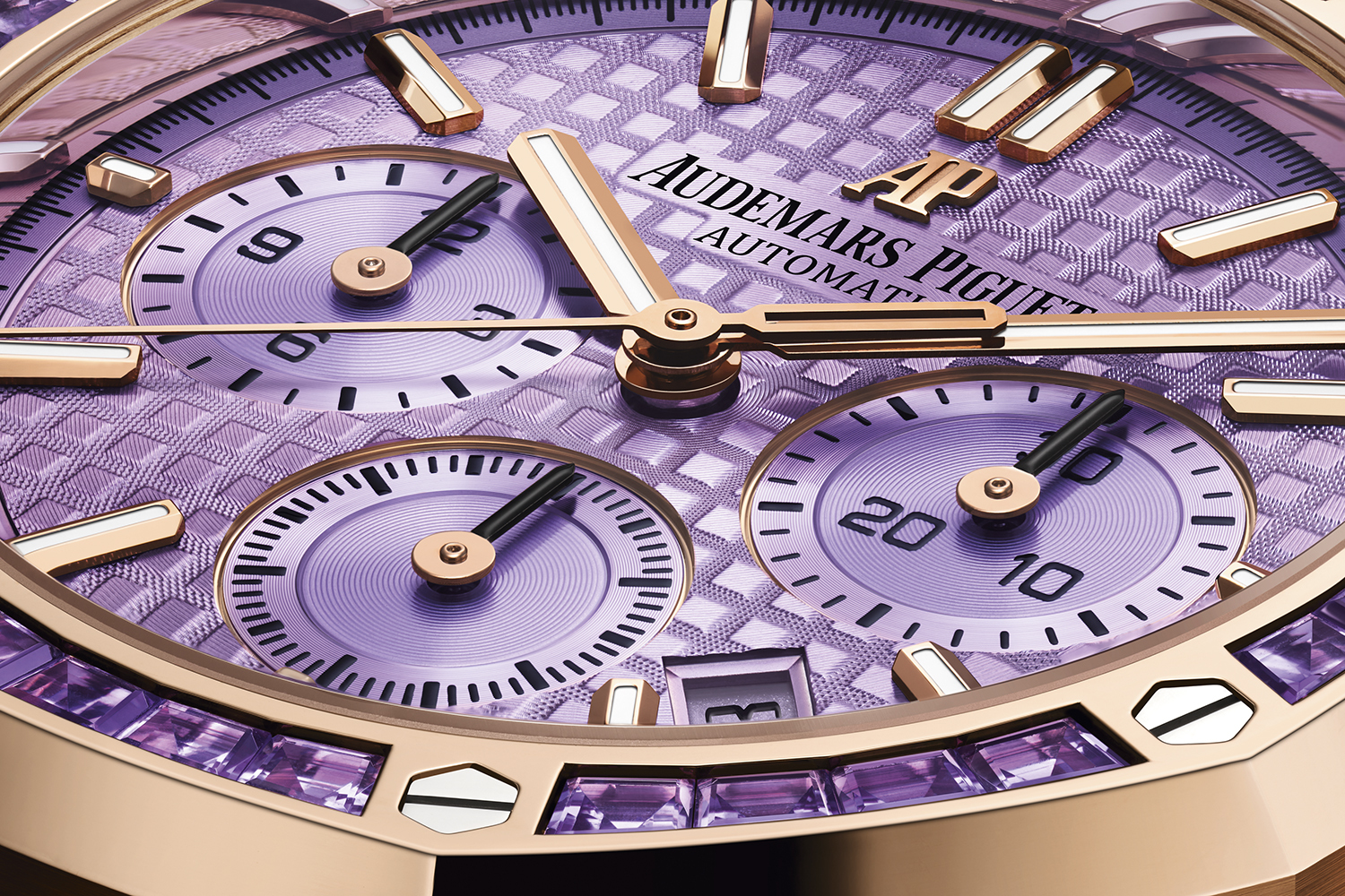 Подобный циферблат-хамелеон представлен и в хронографе Royal Oak Selfwinding Chronograph в корпусе 38 мм и с браслетом из розового золота, в нем тоже заключены несколько новшеств. Циферблат Royal Oak впервые получил интенсивный сиреневый цвет, оттенок которого явственно напоминает аметист. Именно поэтому, также впервые, безель часов декорирован этими драгоценными камнями: 32 экземплярами багетной огранки общим весом 2,85 карата.