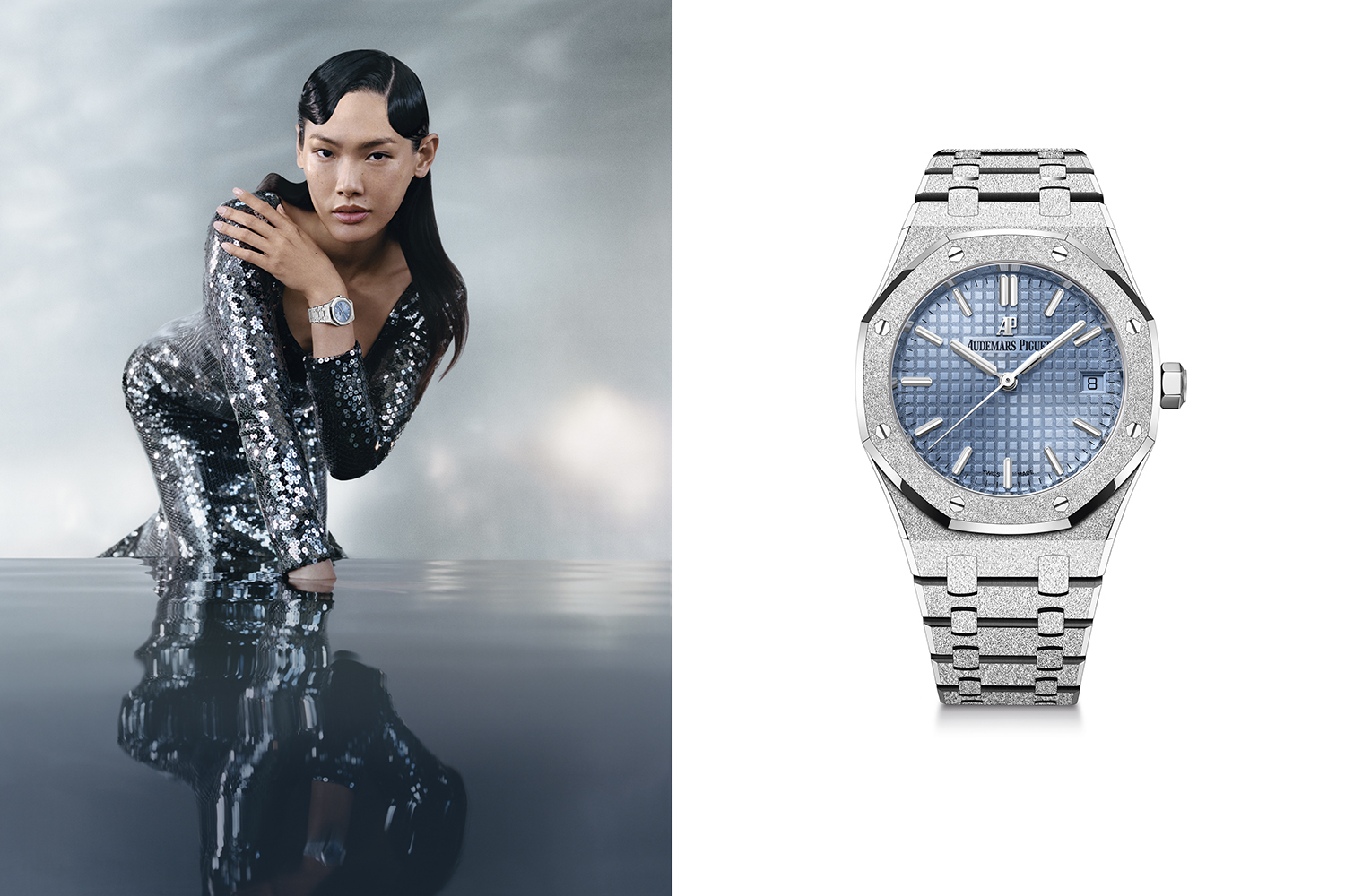 В том же диаметре 34 мм выступает и вторая новинка с корпусом из белого золота Frosted Gold и голубым тоном циферблата, который видоизменяет цвет благодаря небольшому ноу-хау. «Цепляют» эти часы мерцанием корпуса и браслета, а все благодаря покрытию в эффектной технике Frosted Gold, которая была впервые адаптирована к часам Audemars Piguet в 2016 году итальянским ювелирным дизайнером Каролиной Буччи.