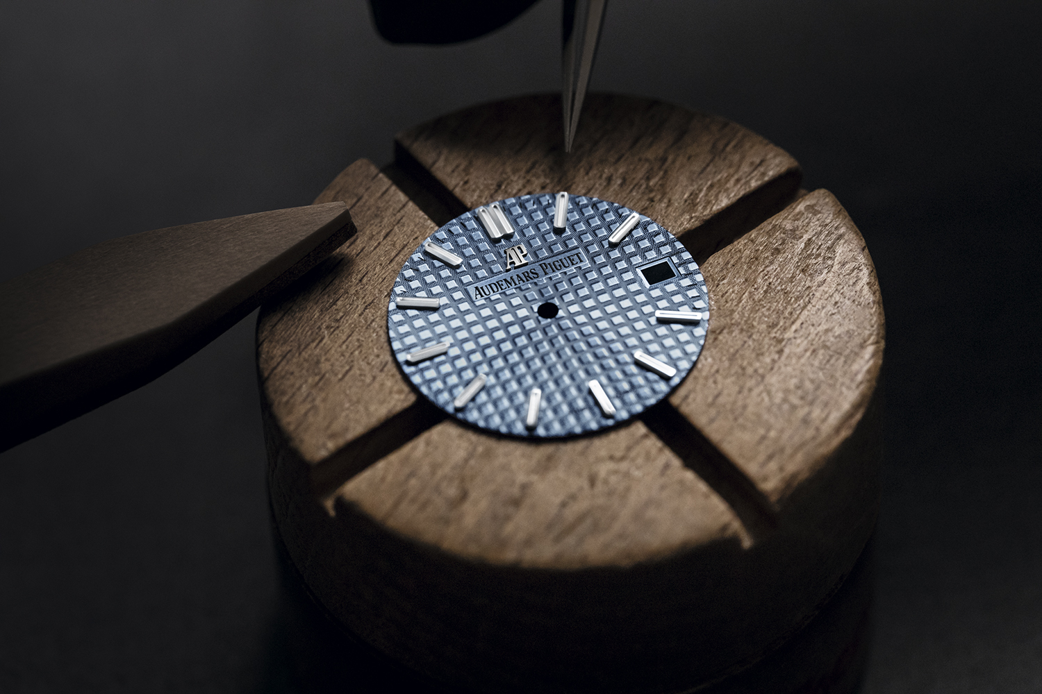 Искрящееся обрамление эхом отражается и на циферблате Grande Tapisserie – поверхность этого традиционного узора получила особое PVD-покрытие, и такой технический штрих сразу создал завораживающие переливы тональности голубого цвета. Окошко даты все того же автоматического калибра 5800 гармонично вписано в квадрат на отметке «3 часа».