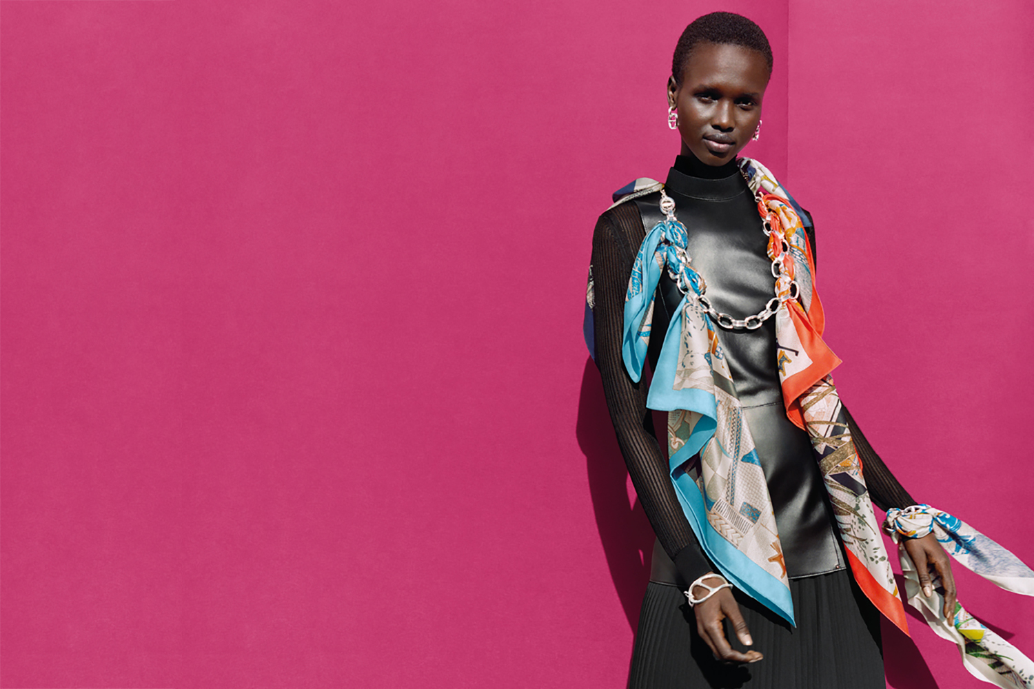 Насколько важно значение платка как стилеобразующего аксессуара в словаре Hermes, можно видеть на том же подиуме, во время дефиле женских коллекций Hermes авторства их креативного директора Вероник Нишанян. Хотя справедливости ради стоит отметить, что та старается не слишком отвлекать внимание от самой одежды. А ведь любой платок Hermes задуман как тот самый отвлекающий маневр, ярчайший акцент и неизбежно притягивающий взгляды элемент, который порой способен полностью преобразить весь образ женщины.