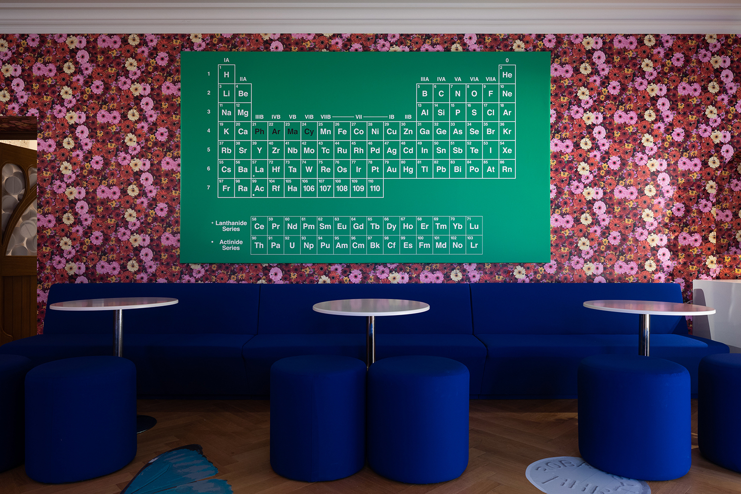 В Москве, уже в своей третьей интеграции Pharmacy, Хёрст использует тот же эффект диссонанса восприятия – посетитель переступает порог старинного особняка, а оказывается в аптеке и не сразу к этому привыкает. По периметру стен первого и второго этажей действительно стоят аптечные стеллажи с лекарствами за стеклянными дверцами (в том числе и с кроверазжижающими, самыми актуальными в ковидную эпоху), все стены оклеены обоями с орнаментом из рецептурных формул, окна «оделись» в псевдовитражи с изображением то ли таблеток, то ли крыльев фирменных бабочек Хёрста, на подоконниках и в стенных нишах красуются гигантские таблетки (одна с надписью Pfizer явно намекает на попытку мировой монополии одной из вакцин против коронавируса), на столах – лампы в виде медицинских колб, а в пролете лестницы поднимающихся наверх слегка пугают гигантский скальпель и подвешенные к потолку скелеты. Словом, интересных деталей, которые можно долго и увлеченно изучать, на каждом этаже Pharmacy предостаточно.
