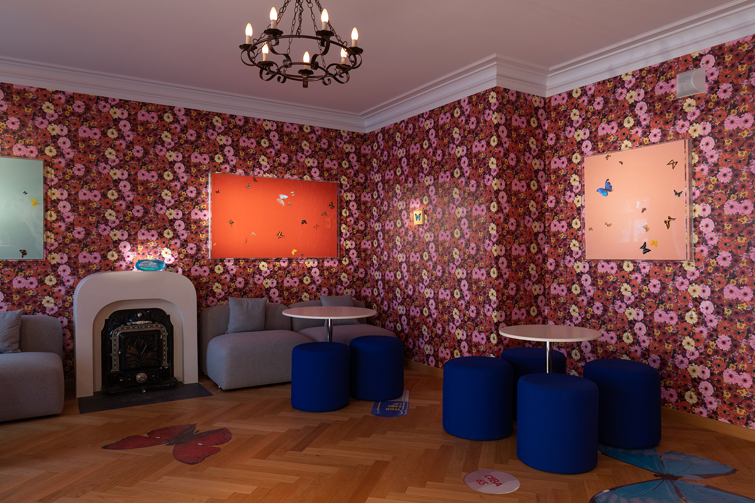 При этом на стенах можно видеть картины из знаменитого цикла Хёрста «Бабочки», в свое время наделавшие много шума и ставшие предметом яростных дискуссий: художник покрывал холсты толстым слоем яркой краски и впускал в свою студию бабочек, некоторые из них находили смерть прямо на холсте...