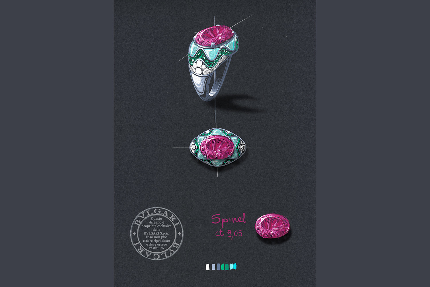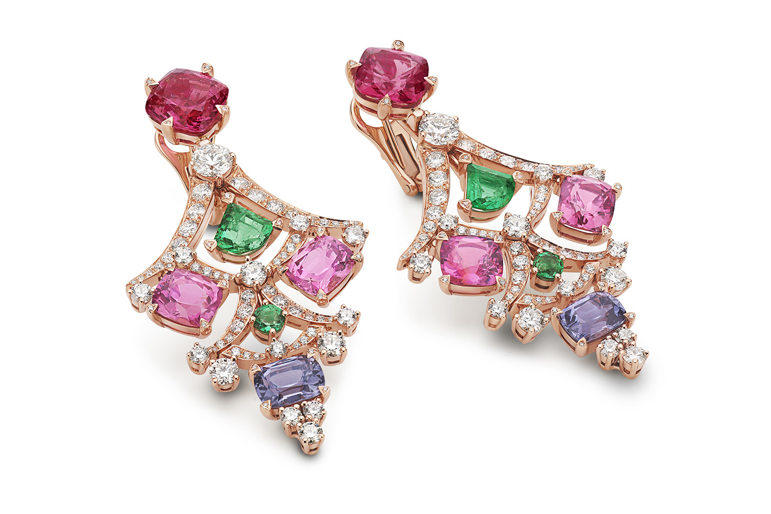 Еще год назад в высокоювелирной коллекции Magnifica Дом представил колье Imperial Spinel с уникальной шпинелью из Таджикистана интенсивного красного цвета огранки «кушон» весом 131,21 карата, ставшую четвертой по величине в мире. В нынешней капсульной коллекции Colour Journeys Spinel столь выдающегося по размеру образца нет, а вот палитра шпинелей из Таджикистана в двадцати украшениях представлена самая живописная.