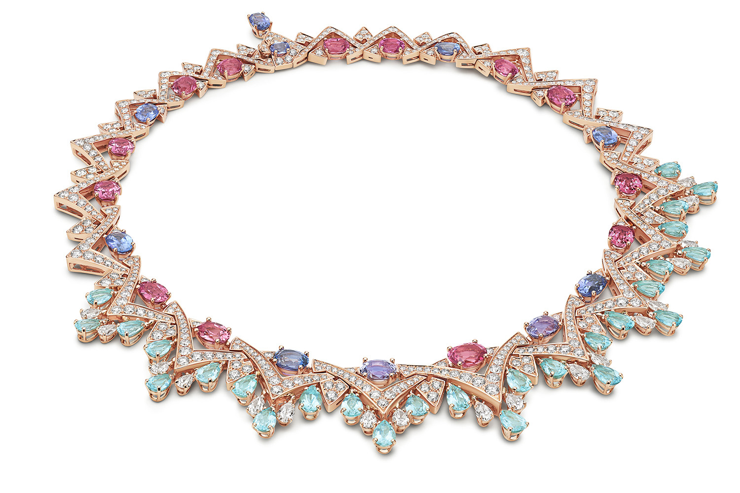 Одно из колье в форме драгоценного воротника служит связующим звеном между первой и второй главами коллекции: оттенки чередующихся в верхнем ряду 13 розовых и 2 лиловых шпинелей овальной огранки (20,95 карата) подчеркнуты в нижнем ряду неоновым сиянием 27 турмалинов параиба огранки «груша» (16,32 карата).