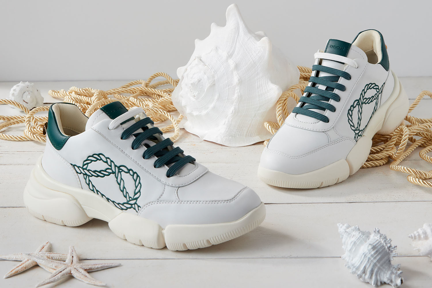 Если хочется чего-то в стиле спорт-шик, то можно обратить внимание на кеды Geox Dalyla, навеянные теннисной эстетикой, и на массивные кроссовки Geox Adacter. Модели украшены вышивкой в виде вензеля – символа коллаборации Geox & Julia Vysotskaya.