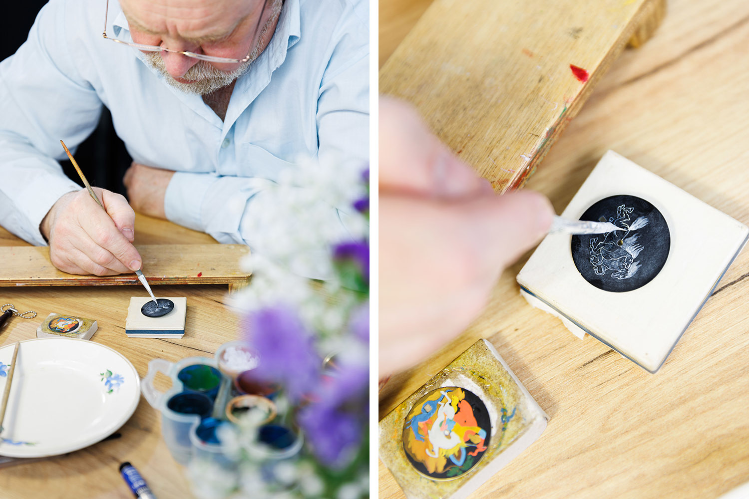 Владеют искусством миниатюры не более десятка мастеров, а реализовать ее на пластине циферблата диаметром 3–4 см могут вообще единицы. Мастера-палешане пишут беличьей кистью, на конце она имеет толщину всего один волос. Вяжут кисти сами из хвостов августовских белок (в этот период их мех прямой и жесткий).