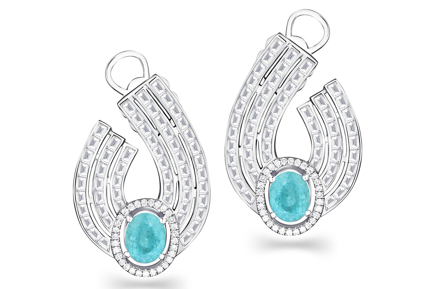 Чаще всего параибу окружают бриллиантовым ореолом, чтобы подчеркнуть цвет. В Parure Atelier это делают и в украшениях из коллекции высокого ювелирного искусства, и на заказ.