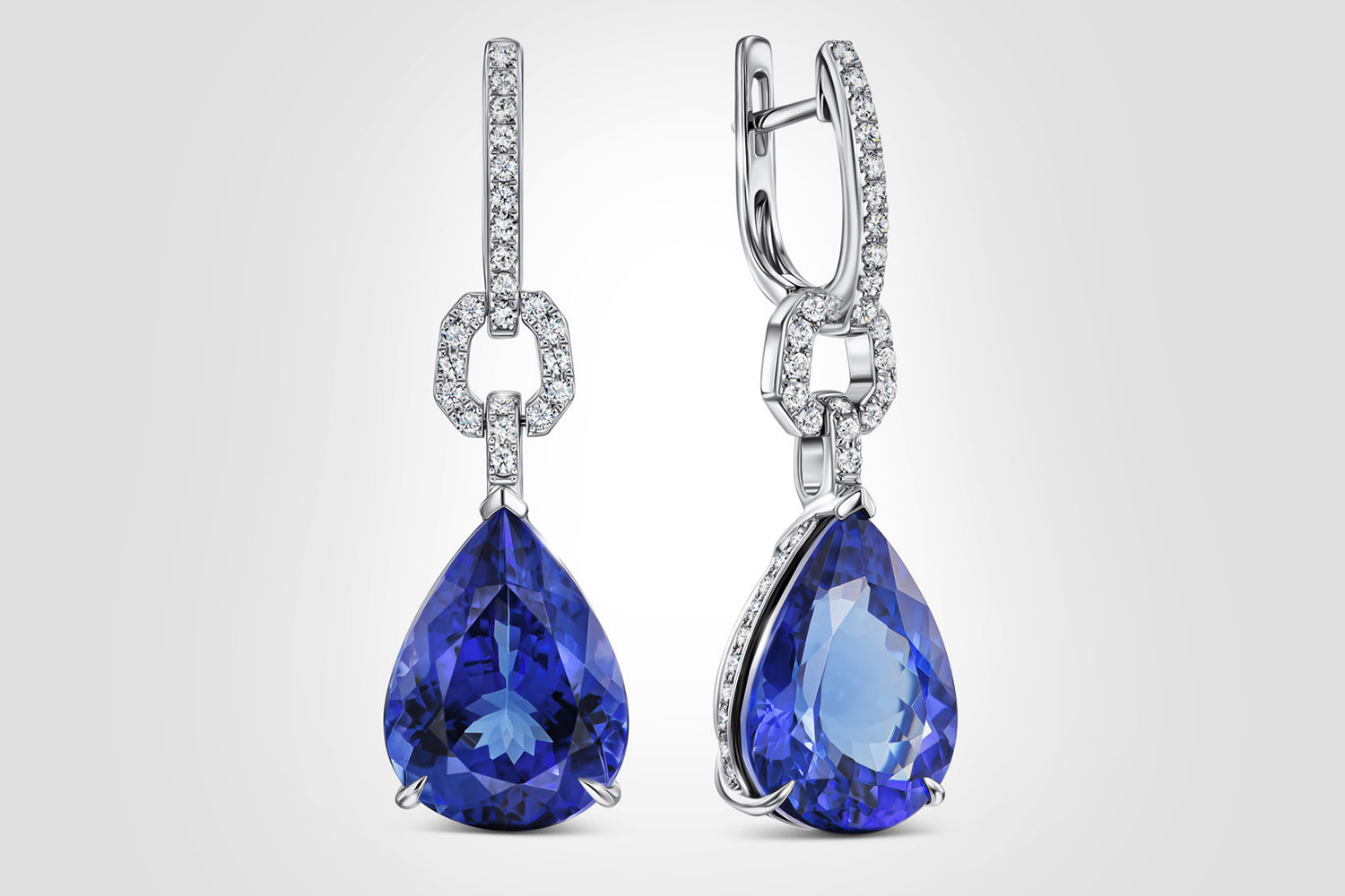Серьги Royal Tanzanite завораживают грушевидными танзанитами глубокого василькового оттенка общим весом 21,38 карата (камни происходят из Танзании). Бриллиантами отмечена только боковая часть оправы, сами же чистые капли самоцветов демонстрируют свое природное великолепие.