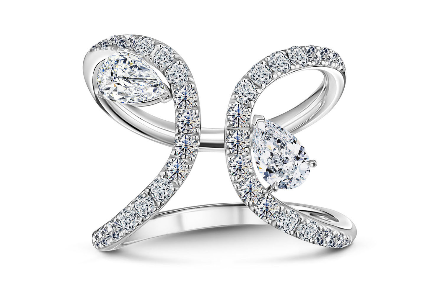 Самым дорогим украшением стало разомкнутое кольцо дизайна Toi et Moi с парой грушевидных бриллиантов каждый весом один карат, при этом соединены они не классической шинкой, а волнистой рекой из бриллиантов.