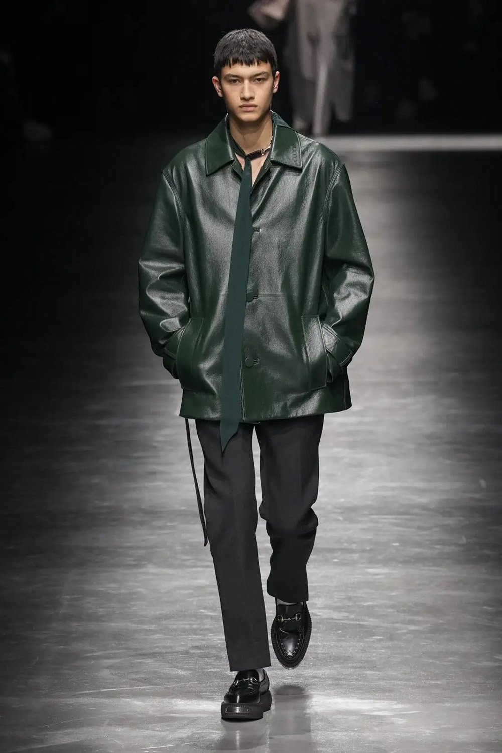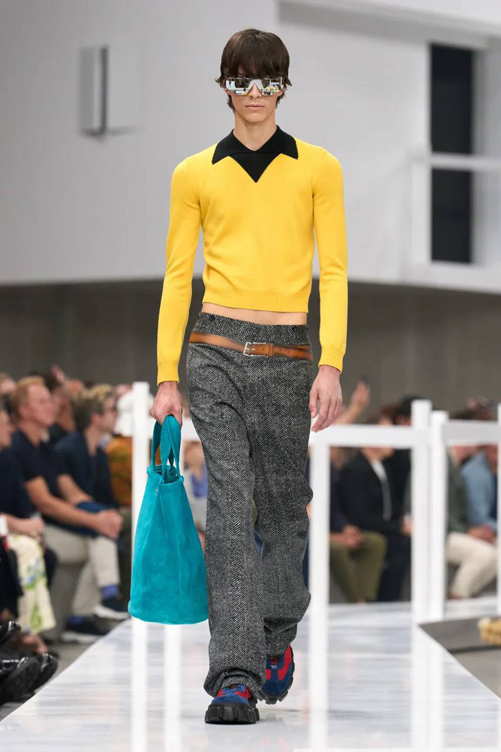 В мужской коллекции весна-лето 2025 JW Anderson представил образ с гигантским галстуком, свисающим до колен. У Prada в шоу для того же сезона есть фальшремни на твидовых брюках. А у Moschino – да, пусть самые обычные серые костюмы в тонкую полоску, но с ироничным обвесом: со множеством креплений и кармашков, куда вложены канцелярские принадлежности, или с брошью в виде яичницы.