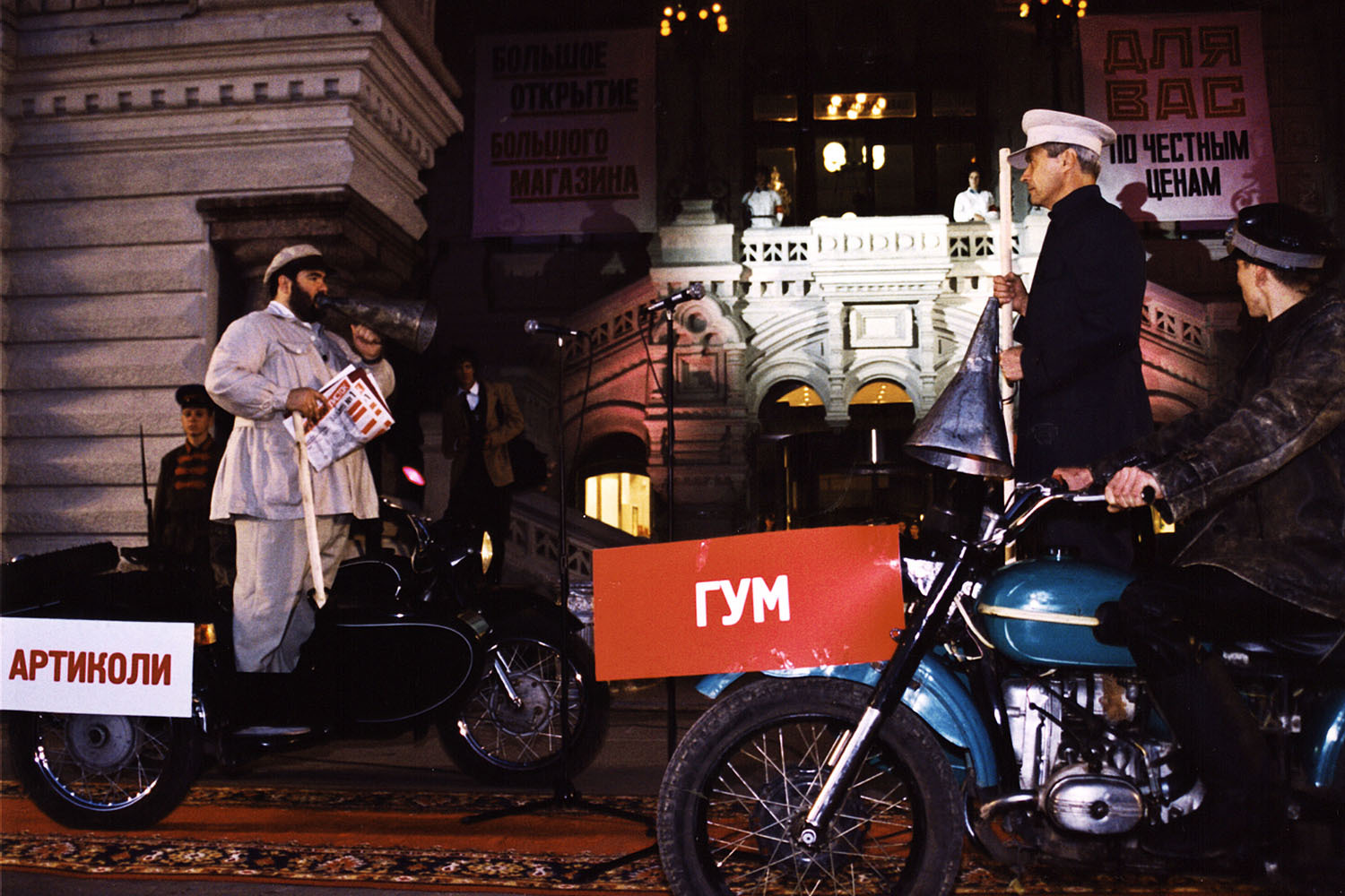 Сам же ГУМ был оформлен в духе конструктивизма и пестрел стилизованными лозунгами.