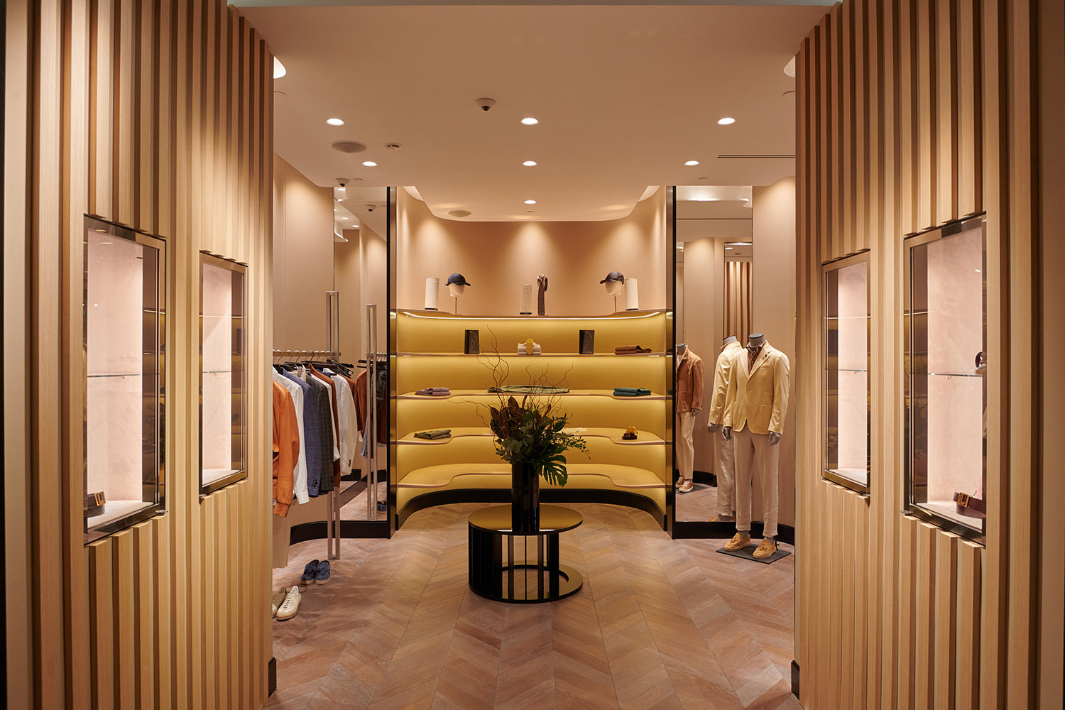 Новый бутик, где уже представлена коллекция Lardini весна-лето 2025, открылся в начале февраля на первой линии ГУМа. Интерьер выдержан в теплых бежевых и элегантных черных оттенках, здесь много света, зеркальных отражений, продумана комфортная зона с уютным диваном. На стенах – постеры, «повествующие» об истории бренда. Все располагает к неспешному шопингу, к этому «скольжению над вещами, без тяжести в сердце».