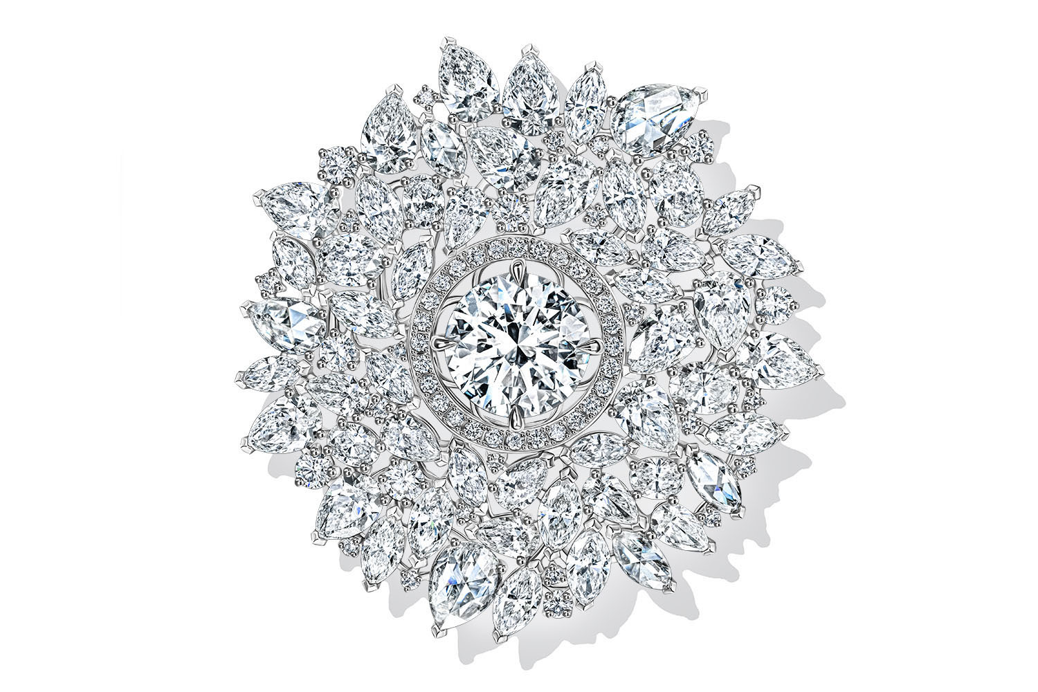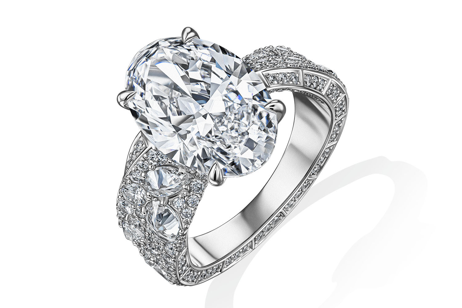 Все предметы создаются малыми сериями, иногда в единственном экземпляре, как недавно представленное кольцо «Пируэт», в котором центральный овальный бриллиант массой 5,02 карата сияет на объемном крученом бэнде с мозаичным паве, словно на струящейся бриллиантовой ленте.